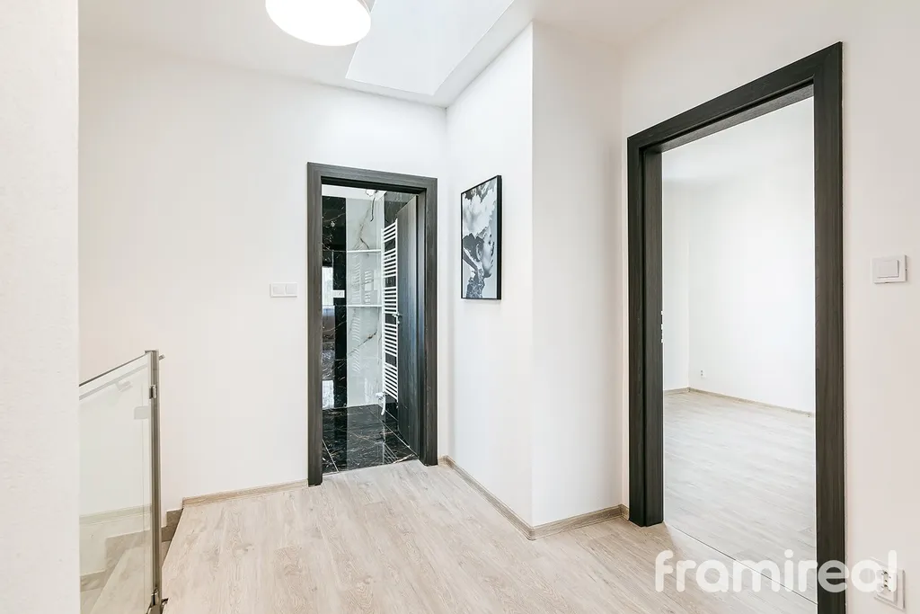 Dům je rozdělen do tří logicky uspořádaných podlaží. V přízemí se nachází prostorné zádveří s dostatkem místa pro odložení věcí, dále následuje velkorysý obývací pokoj s přípravou pro kuchyň a jídelnu. Díky velkoformátovým oknům je interiér prosvětlený a lodžie nabízí ideální prostor pro ranní kávu nebo večerní relaxaci. Přízemí dále doplňuje samostatná toaleta a příprava na předokenní žaluzie, které oceníte zejména v letních měsících.