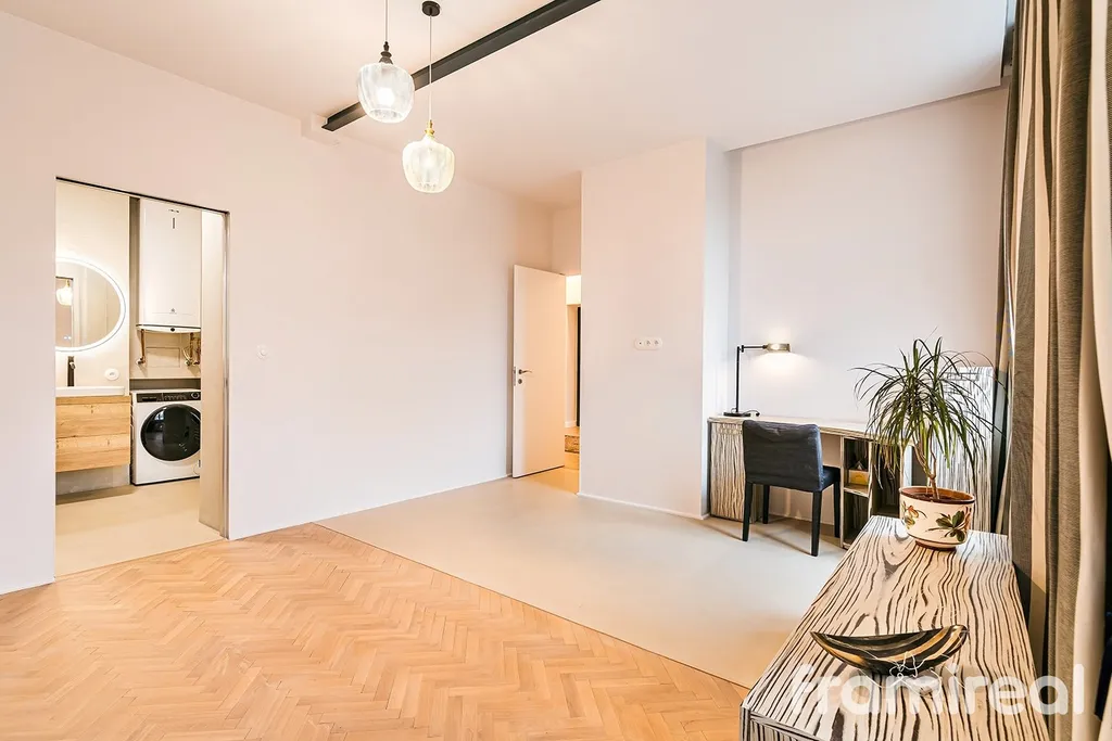 Dominantou je prostorný obývací pokoj propojený s moderní kuchyňskou linkou vybavenou vestavnými spotřebiči – americkou lednicí, myčkou, varnou deskou s integrovaným výsuvným odsavačem par (downdraft) a dalšími prvky, které zajišťují pohodlné každodenní užívání. Zapuštěná LED svítidla v podhledech podtrhují elegantní atmosféru celého interiéru. V rámci rekonstrukce byly použity kvalitní povrchové materiály, včetně designové stěrky a renovovaných parketových podlah, které dodávají prostoru nadčasový a harmonický charakter.