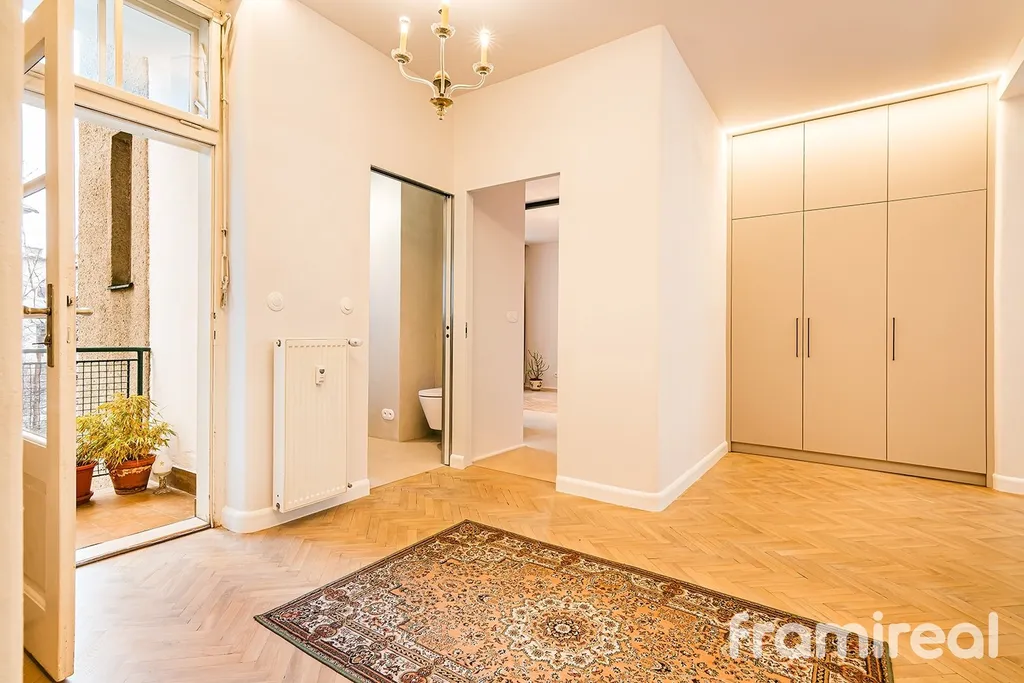 Velkorysý úložný prostor zajišťují vestavěné skříně, které zachovávají čistou a jednolitou linii interiéru. K bytu náleží lodžie s výhledem do upravené zahrady ve vnitrobloku, sklepní kóje a pohodlný přístup zajišťuje výtah. Vysoké stropy spolu s použitím kvalitních materiálů podtrhují reprezentativní charakter celého prostoru.