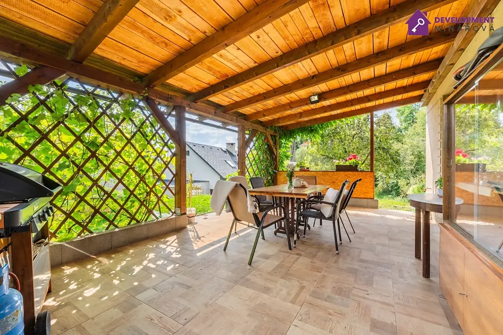 • Nová terasa s dřevěnou pergolou ideální pro posezení s rodinou a zahradní domek