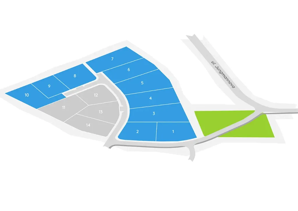 - 9 stavebních pozemků: 1 082 m2, 1 000 m2, 1 427 m2, 1 166 m2, 1309 m2, 1 097 m2, 950 m2, 733 m2, 1 057 m2
