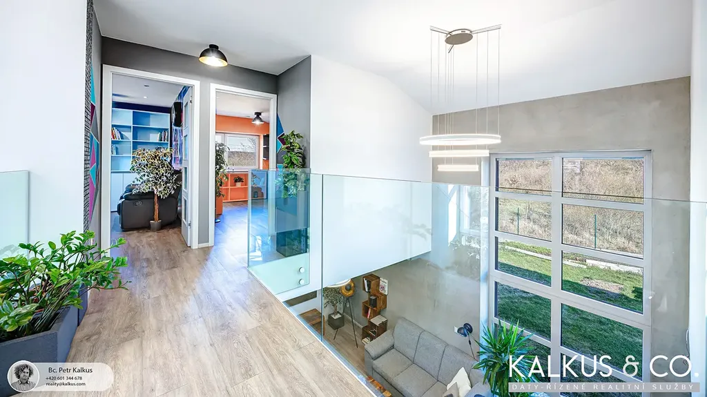 S dispozicí 6+kk a užitnou plochou 219 m² na rovinatém pozemku o výměře 1 530 m2 nabízí tento dům zázemí i pro větší rodinu. Tři koupelny, wellness místnost s přípravou pro saunu, vysoké stropy a otevřený prostor napříč dvěma podlažími vytvářejí dojem volnosti a vzdušnosti. Děti mají v patře své soukromí, přesto galeriový průhled z horní chodby do obytného prostoru zajišťuje, že rodina zůstává v kontaktu – doslova i symbolicky.
