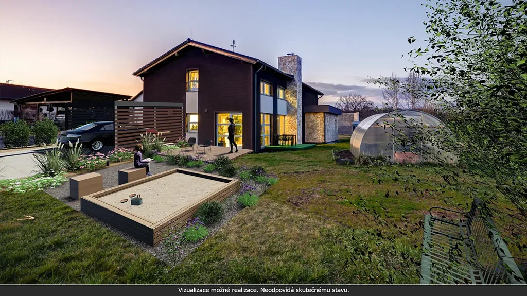 Zahrada obklopuje dům jako přirozené pokračování interiéru. Ocení ji nejen děti, ale i nadšenci do pěstování – díky rozloze a orientaci je připravena na sezónní rytmus zeleniny i relaxace. Samotný provoz domu se řídí přes inteligentní systém LOXONE, který automatizuje mimo jiné osvětlení, vytápění, venkovní žaluzie, přístupy, zabezpečení, multimédia i zavlažování. Dům se přizpůsobuje dennímu rytmu domácnosti a dokáže si i „zavolat pomoc“ – například při aktivaci požárních čidel nebo při simulaci přítomnosti při odjezdu na dovolenou.