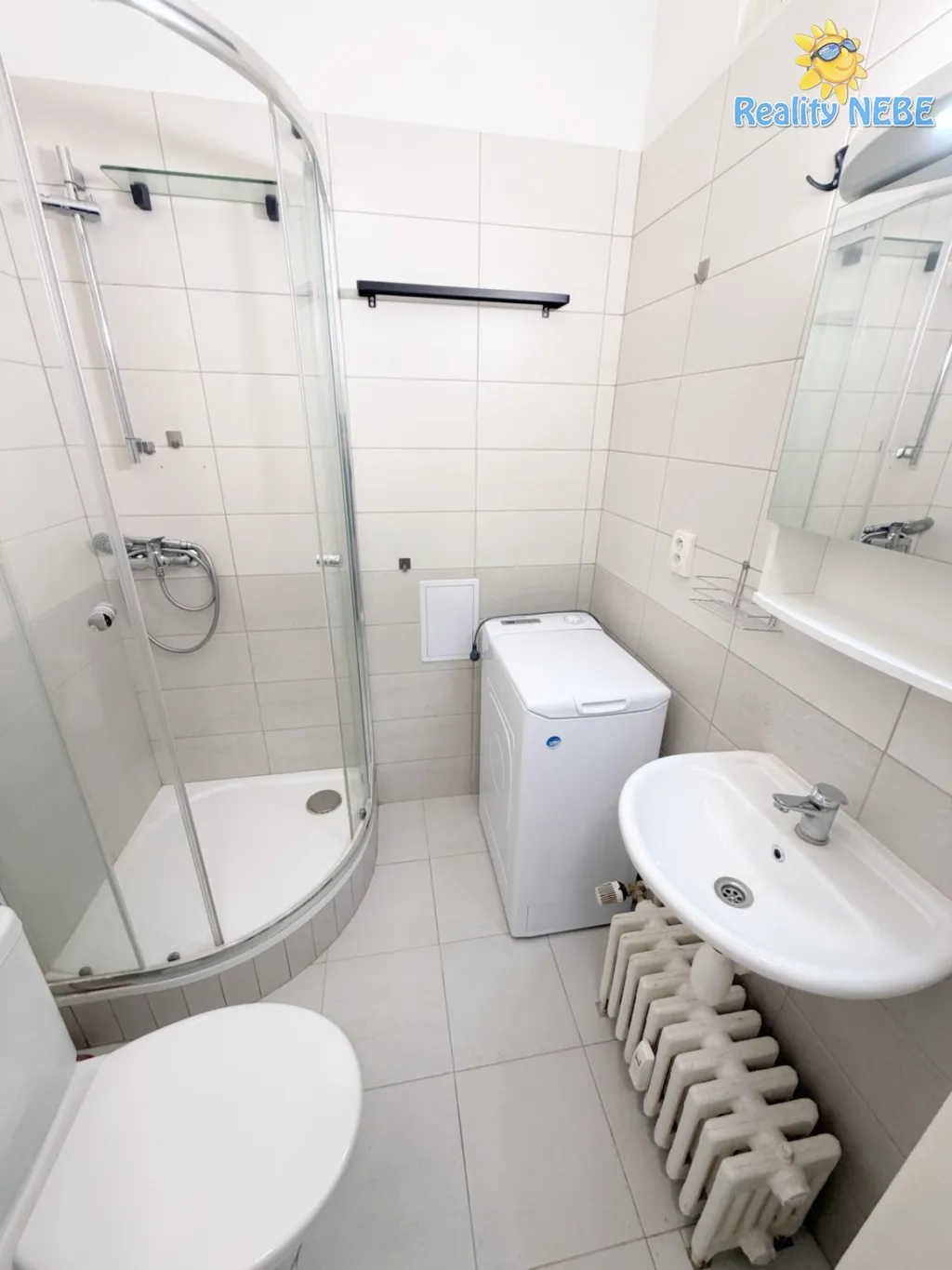 Nabízen je jako kompletně zařízený dle fotografií, tvoří jej obytný pokoj s kuchyňským koutem (linka se spotřebiči a lednice zůstávají), dále koupelna se sprchovým koutem, WC a pračkou.