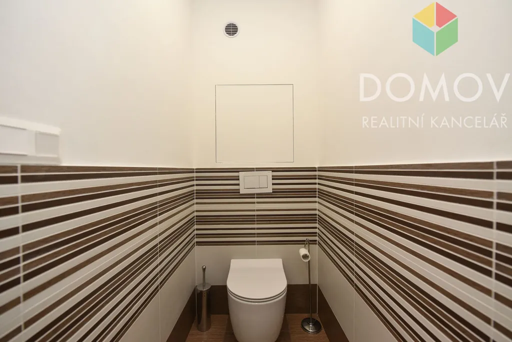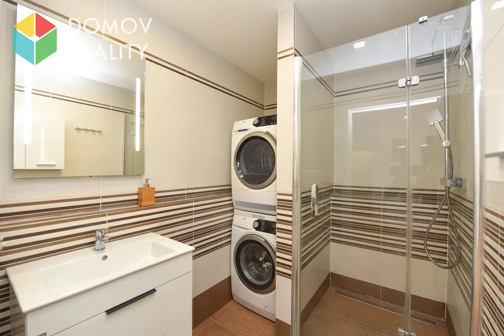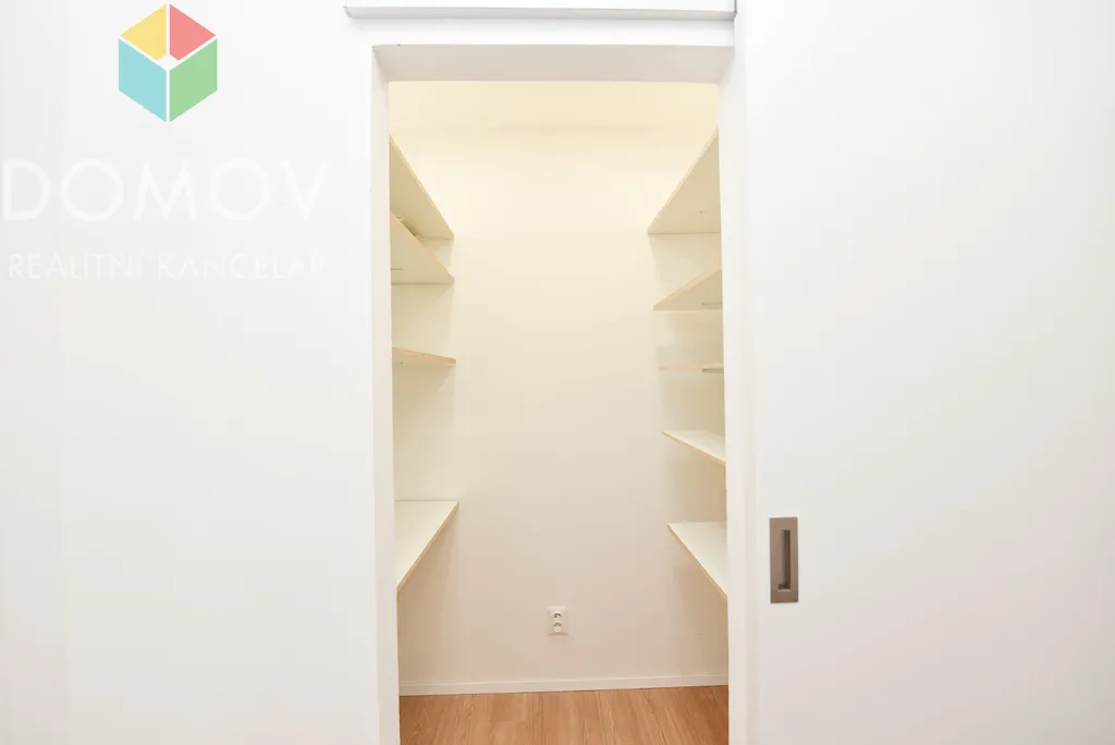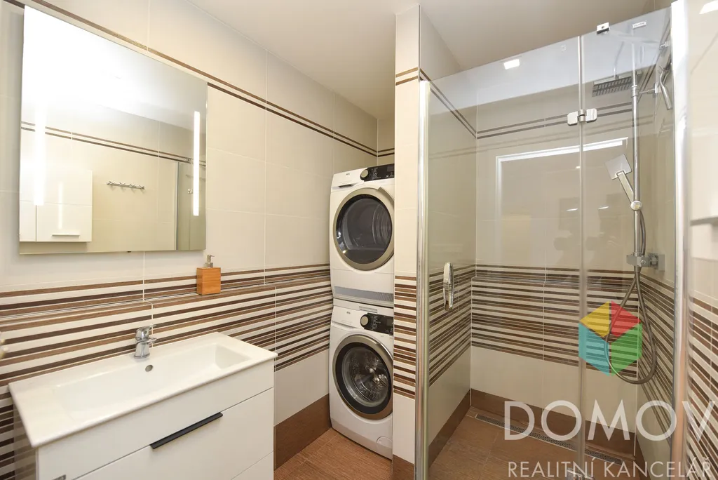 Dále byt nabízí ložnici s vestavěnými skříněmi a televizí, elegantní koupelnu se sprchovým koutem, pračkou se sušičkou, samostatné WC a praktickou komoru ve vstupní chodbě vybavenou regály.