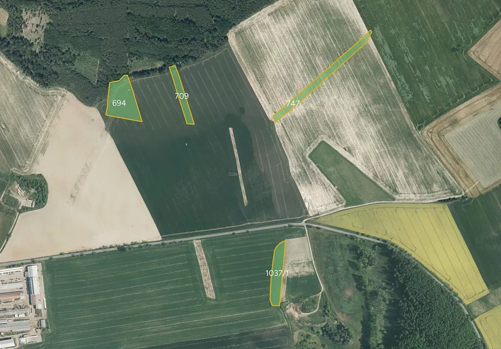 Předmětem prodeje jsou parcely č. 694, 709, 747 a 1037/1, zapsané na LV 557. Pozemky mají společnou výměru 21 382 m². K prodeji je majoritní vlastnictví - 16 036 m². Celá plocha je vedena jako orná půda.