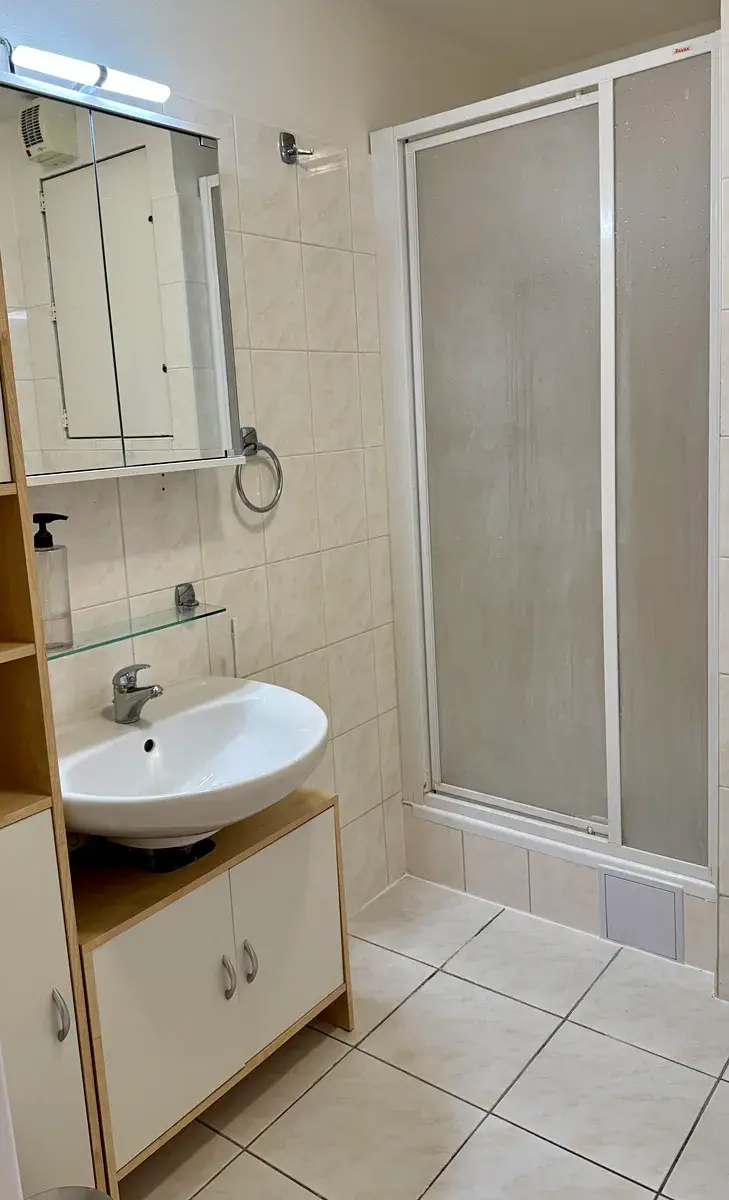 Za vstupem do bytu najdete prostornou předsíň s vchodem do koupelny se sprchovým koutem a WC a vstup do pokoje s kuchyňskou linkou a balkonem.