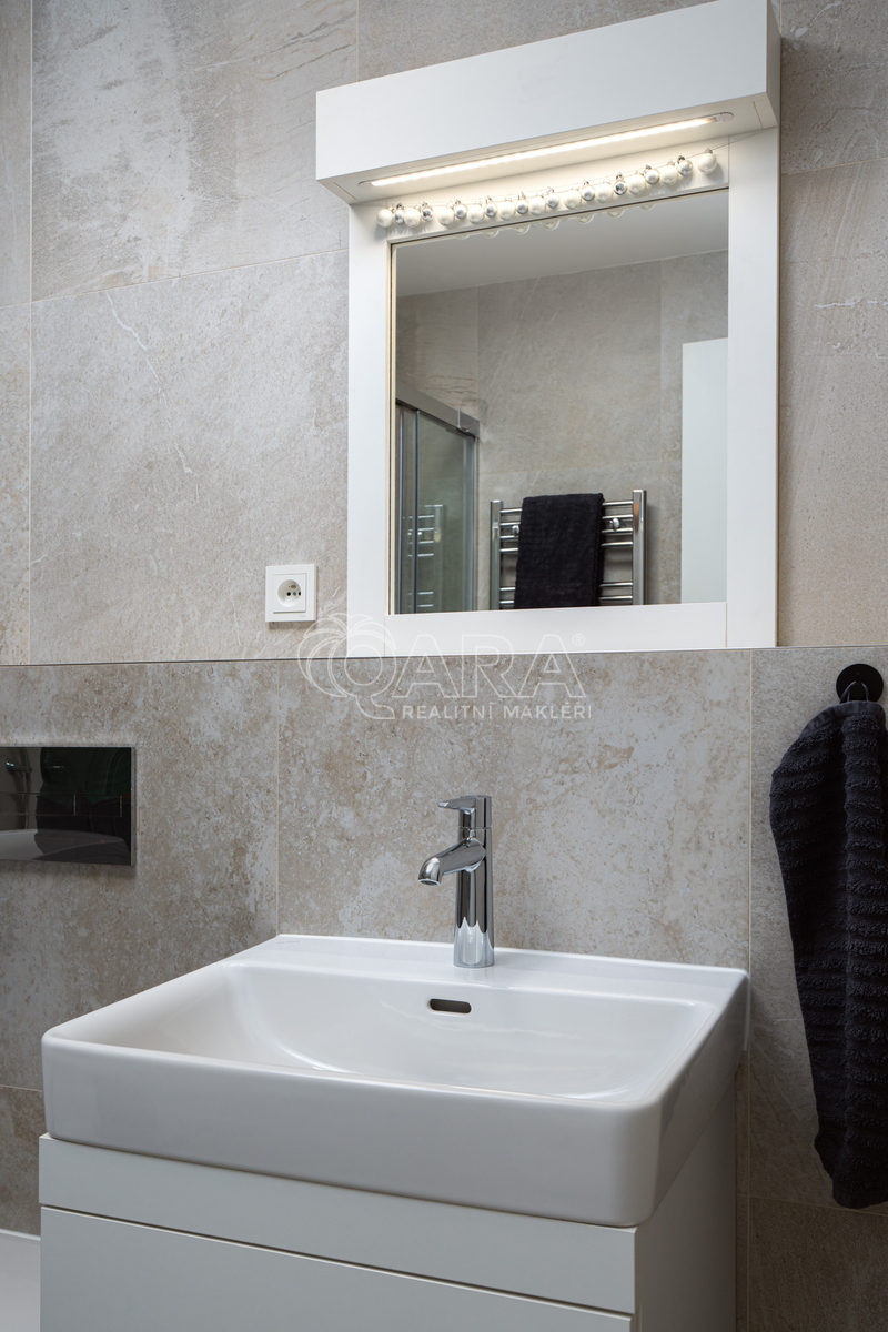 Vstupní chodba s vestavěnou skříní nabízí dostatek úložného prostoru. Dominantou bytu je velký obytný prostor, kde je kuchyňský kout prakticky oddělen od obývací části, díky čemuž byt působí vzdušně a otevřeně. Z obytné části je přímý vstup na terasu, ideální pro ranní kávu nebo večerní relax.