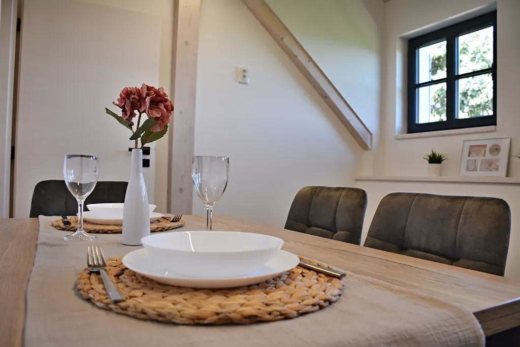 Součástí vybavení je kuchyňská linka na míru se spotřebiči, jídelní stůl se židlemi a v obývací části sedací souprava s konferenčním stolkem. V ložní části pak vysoká postel s matracemi.
