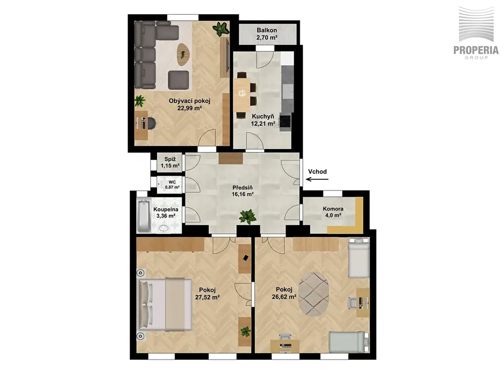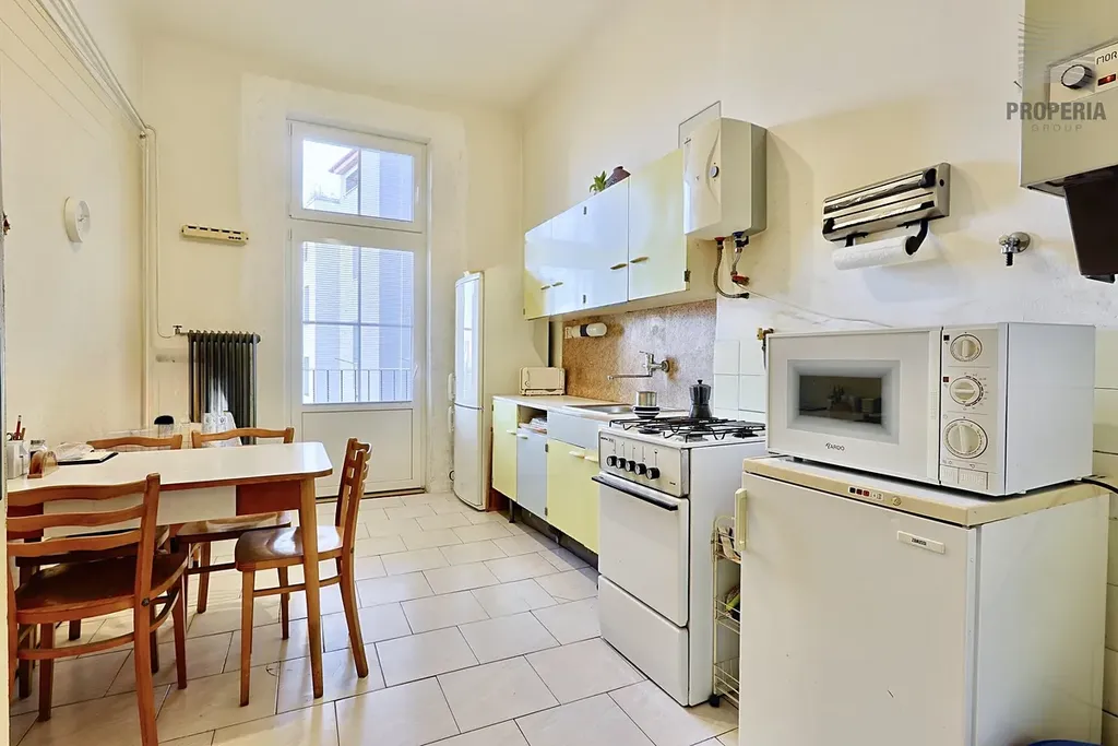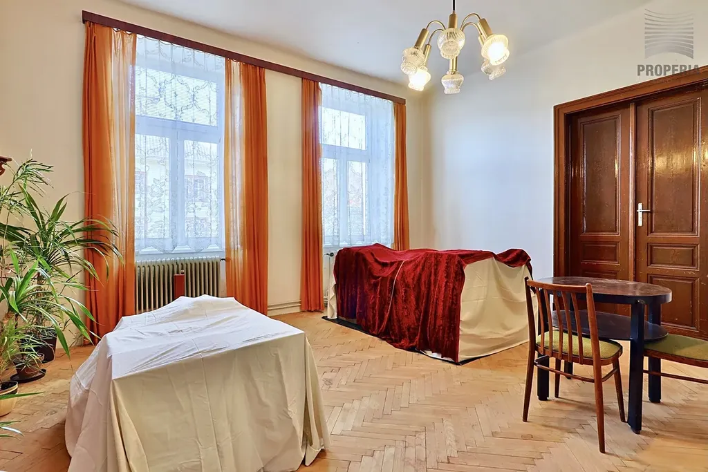 Parametry pokojů: kuchyně 12,21 m2, pokoj do dvora 23 m2 a dva pokoje do ulice 27,5m2 a 26, 6 m2. Samostatná koupelna 3,36 m2, WC 0, 87 m2, předsíň 16 m2, komora 4 m2, spíž 1,15 m2 a balkón do vnitrobloku 3 m2.