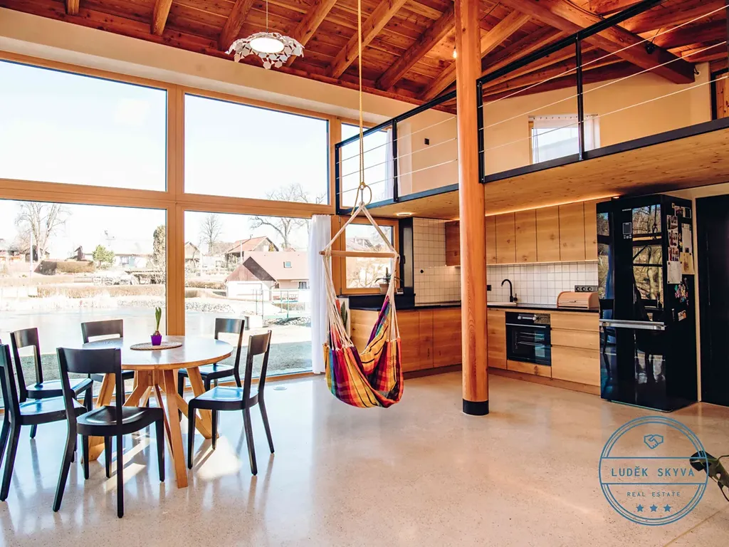 Tento dům o celkové užitné ploše 210 m² (z toho 45 m² tvoří otevřené loftové patro) byl navržen s citem pro estetiku, praktičnost a propojení s přírodou. Majitelé – oba výtvarníci – jej proměnili v jedinečný prostor, který působí teple, vzdušně a inspirativně.