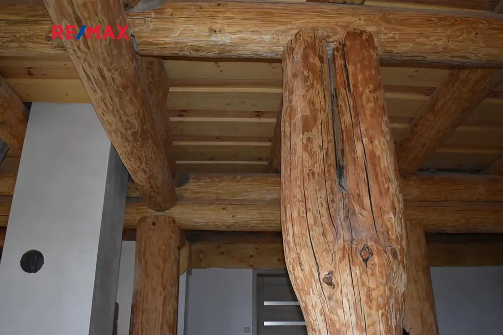 2NP a 3NP – srubová obytná část (výměra 434,8 m², započit.plocha 219,2 m²), 6 místností pro komfortní rodinné bydlení nebo ubytovací kapacitu, krytá srubová terasa s letní kuchyní, balkon – výhled do krajiny