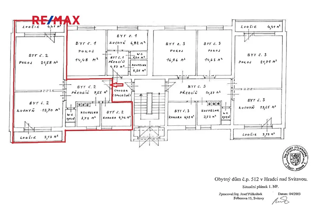 Prodej prostorného bytu v osobním vlastnictví o velikosti 1+1 se 2 lodžiemi, umístěný v 1. patře (zvýšeném přízemí) zděného domu na konci Svitav, resp. začátku Hradce nad Svitavou.