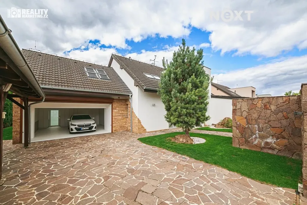 Vyhřívaný příjezd a vstup, dvojgaráž + přístřešek, skladovací prostory.