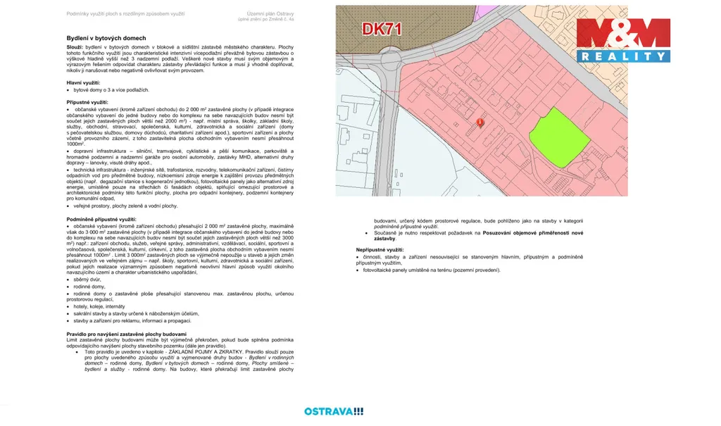 Nabízíme k prodeji soubor pozemků o celkové výměře 1 118 m² v rozvíjející se části Ostravy – Hrušově. Pozemek je dle platného územního plánu určen pro bydlení v bytových domech, přičemž je zde umožněna výstavba bytových domů o třech a více nadzemních podlažích. Současně je přípustné také využití pro občanskou vybavenost, například pro obchodní, stravovací, zdravotnická či sociální zařízení, včetně domovů pro seniory nebo domů s pečovatelskou službou.