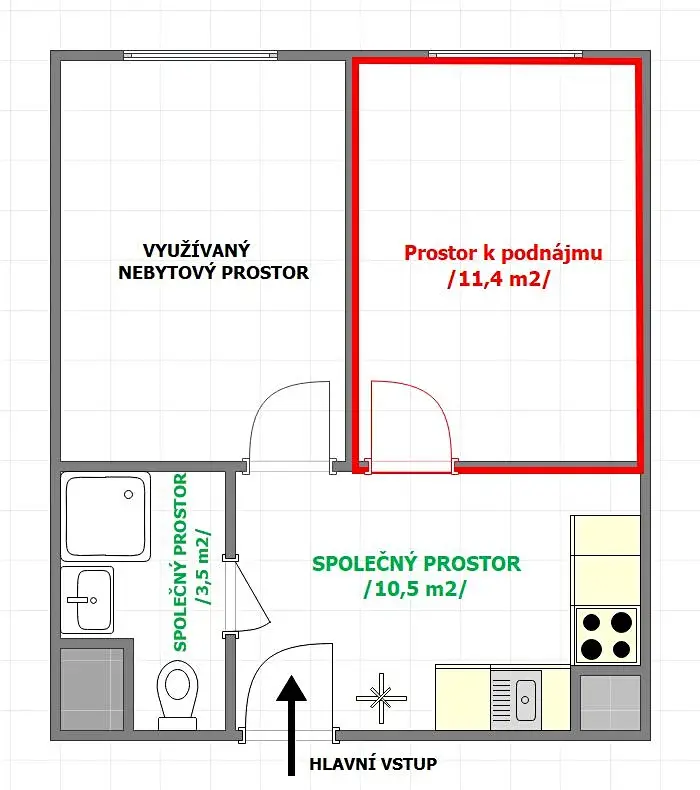 Exkluzivně Vám nabízíme k podnájmu uzamykatelný nebytový prostor o ploše 11,4 m2 /šířka 2,85 m x délka 4,0 m/, který je součástí nebytového prostoru č. 903, situovaný v přízemí domu na adrese Kojetická čp. 1021 v Neratovicích. Hlavní vstup do budovy je z boční strany domu směrem od lékárny /Moje lékárna/. Společně s nebytovým prostorem lze využívat místnost s kuchyňskou linkou a dále koupelnu s toaletou. Tyto společné prostory se využívají společně s nájemcem druhého nebytového prostoru - viz. půdorys. Podnájem nebytového prostoru je zejména určen k provozování živnosti jako provozovna péče o tělo /kosmetika, masáže/ nebo jako kancelář pro vedení účetnictví apod. Měsíční nájemné je ve výši 5.000 Kč + zálohy na služby ve výši 1.204 Kč + elektřina 250 Kč. Jistota se skládá ve výši 10.000 Kč, provize RK ve výši 6.454 Kč. Prostor je k nastěhování od 1.2.2026. Více informací nebo prohlídku si domluvte telefonicky.