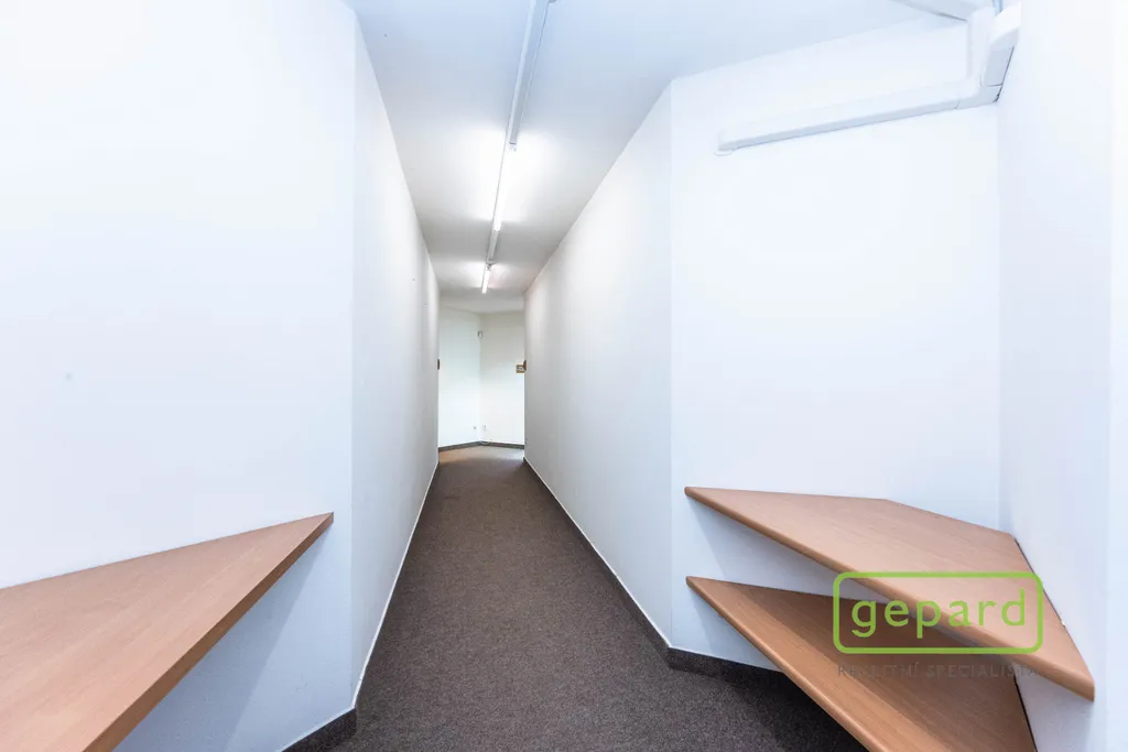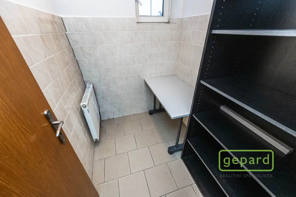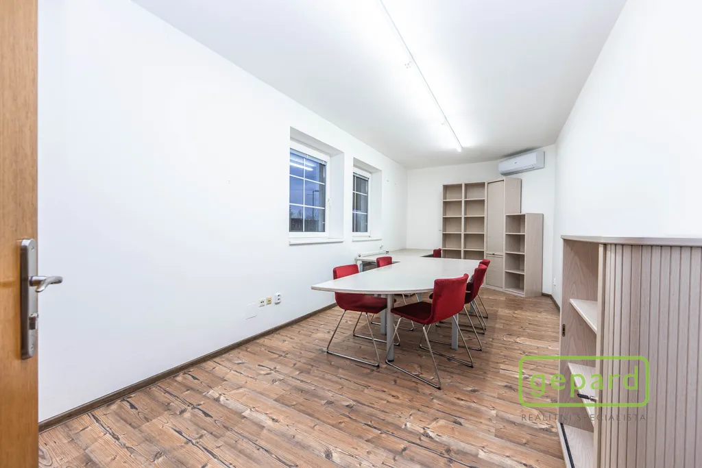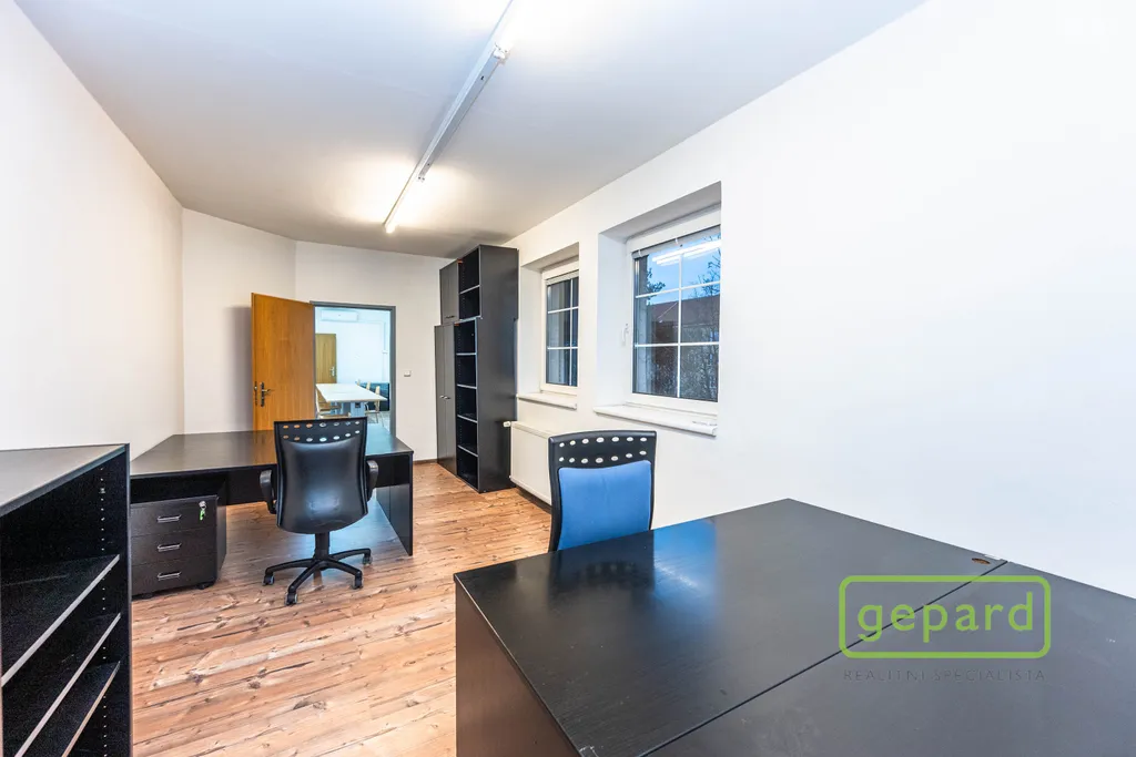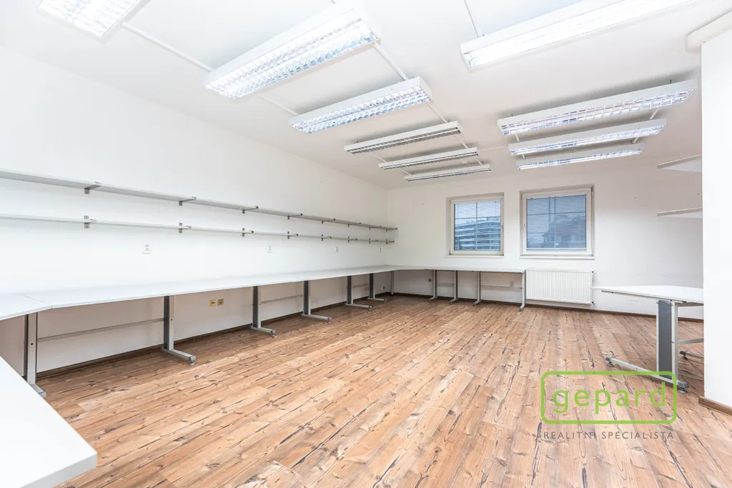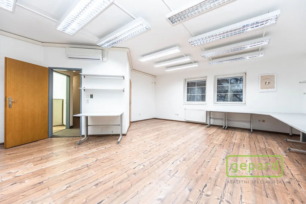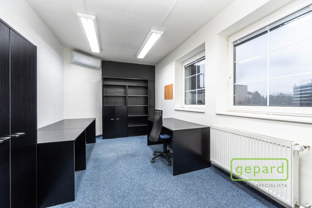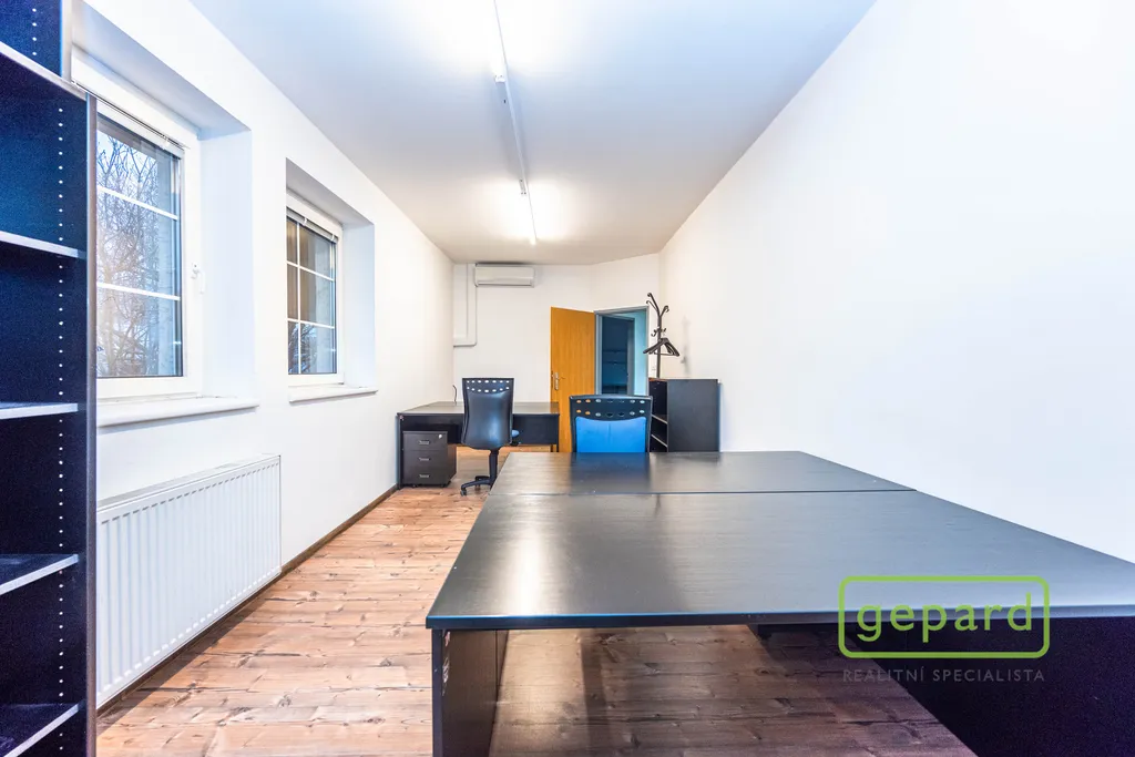 Nabízený prostor o rozloze 188,10 m2 zaujímá celé 2. nadzemní podlaží třípodlažní cihlové budovy. Dispozice je uvedena v přiloženém půdorysu. Je zde šest kanceláří: 41,20 m2; 19,70 m2; 19,60 m2; 19,30 m2; 16,10 m2 a 15,00 m2 a dále kuchyňka, komora, šatna a 2x WC. Vybavení znázorněné na fotografiích může být ponecháno nebo po dohodě vyklizeno. Okna kanceláří směřují na jihovýchod a severozápad, topení je centrální zajištěné společným plynovým kotlem pro dvě podlaží, v prostoru jsou nainstalovány 4 klimatizační jednotky. Celá budova je zabezpečena zabezpečovacím zařízením včetně venkovních kamer. V přízemí budovy je klimatizovaná místnost (3 m2), která může být využita pro datové úložiště. Parkování je možné přímo u budovy v placené zóně.