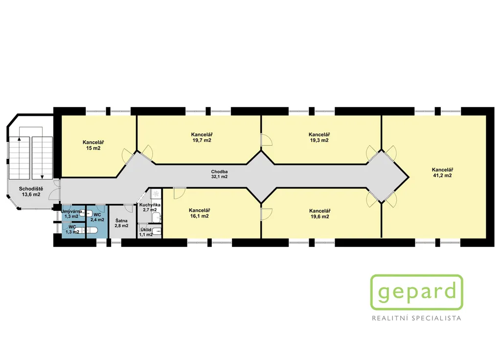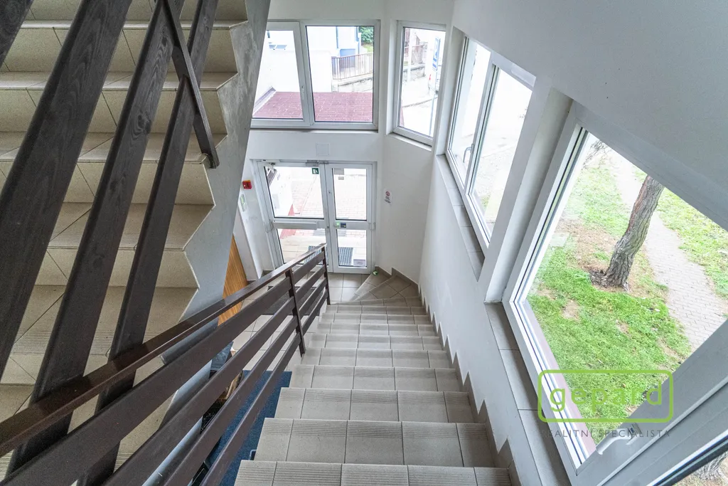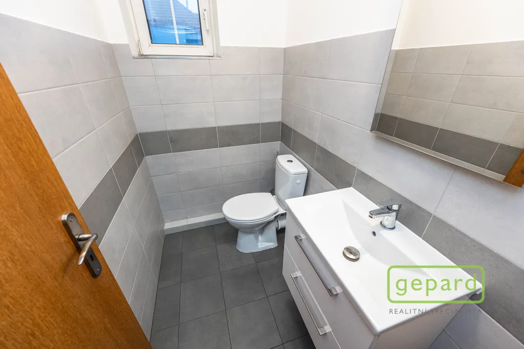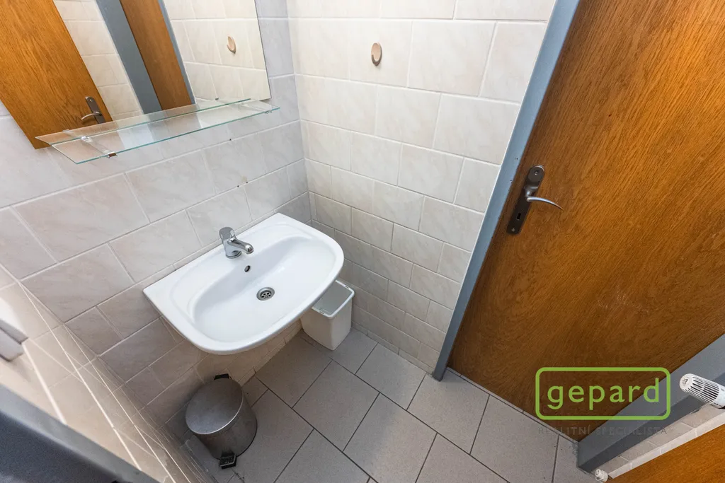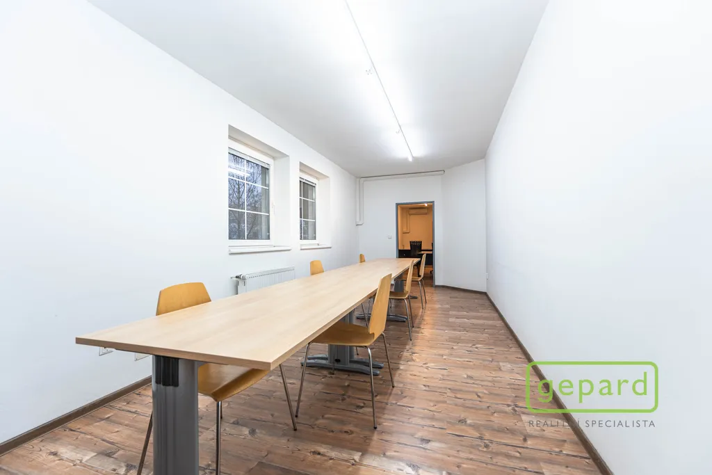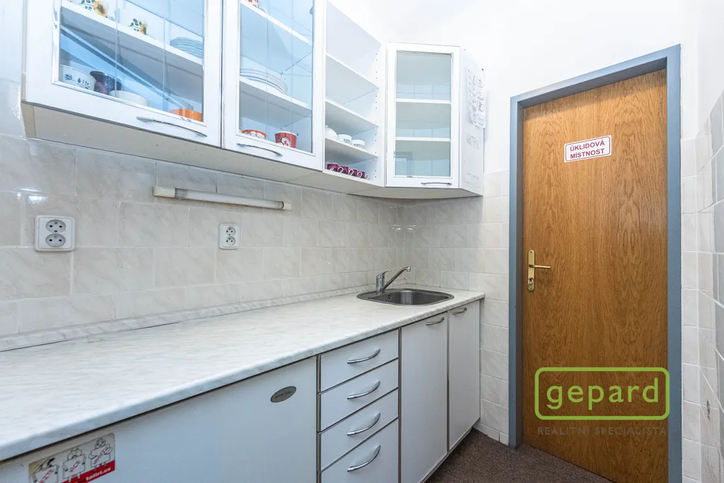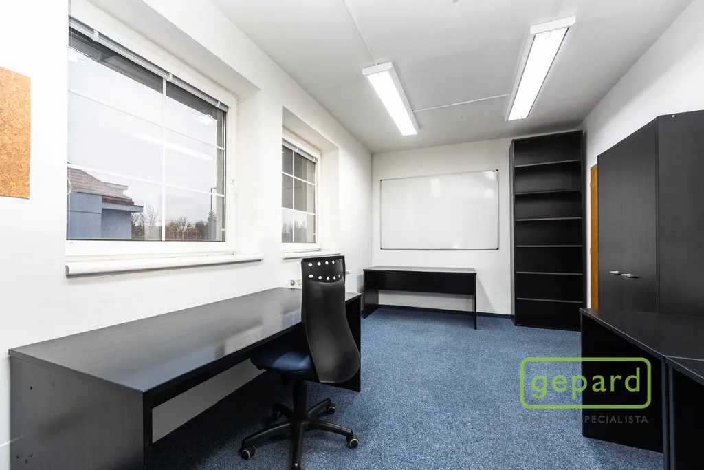 Nabízený prostor o rozloze 188,10 m2 zaujímá celé 2. nadzemní podlaží třípodlažní cihlové budovy. Dispozice je uvedena v přiloženém půdorysu. Je zde šest kanceláří: 41,20 m2; 19,70 m2; 19,60 m2; 19,30 m2; 16,10 m2 a 15,00 m2 a dále kuchyňka, komora, šatna a 2x WC. Vybavení znázorněné na fotografiích může být ponecháno nebo po dohodě vyklizeno. Okna kanceláří směřují na jihovýchod a severozápad, topení je centrální zajištěné společným plynovým kotlem pro dvě podlaží, v prostoru jsou nainstalovány 4 klimatizační jednotky. Celá budova je zabezpečena zabezpečovacím zařízením včetně venkovních kamer. V přízemí budovy je klimatizovaná místnost (3 m2), která může být využita pro datové úložiště. Parkování je možné přímo u budovy v placené zóně.