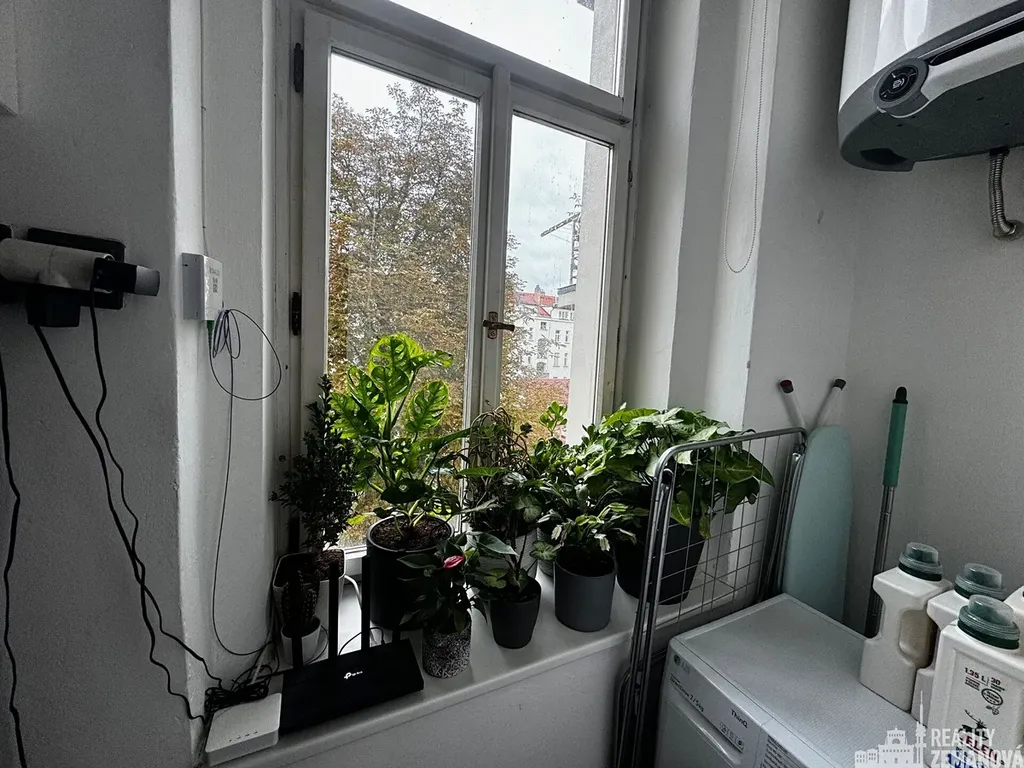 Dispozice bytu: předsíň s oknem na východ do vnitrobloku s automatickou pračkou a bojlerem pro ohřev teplé vody, propojená do kuchyňského prostoru s pěknou linkou, elektrickým sporákem, lednicí a bílým kuchyňským stolem se 4 židlemi. Z kuchyně je vstup do koupelny (se sprchovým koutem, umyvadlem a WC) a do prostorného pokoje orientovaného do Řipské ulice na západní stranu. V pokoji je bílá skříň/viz foto