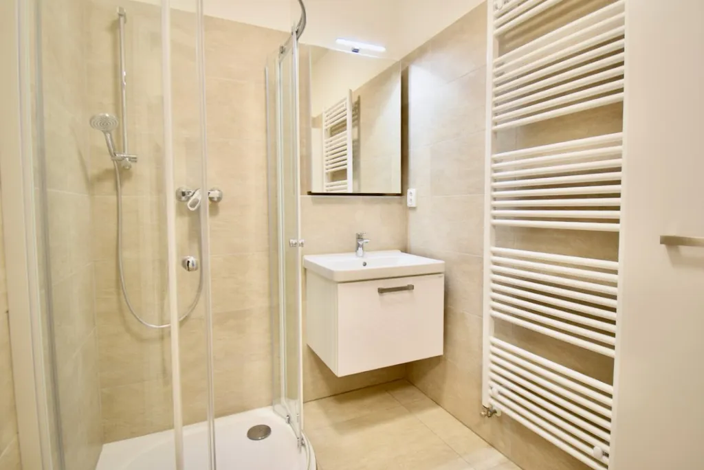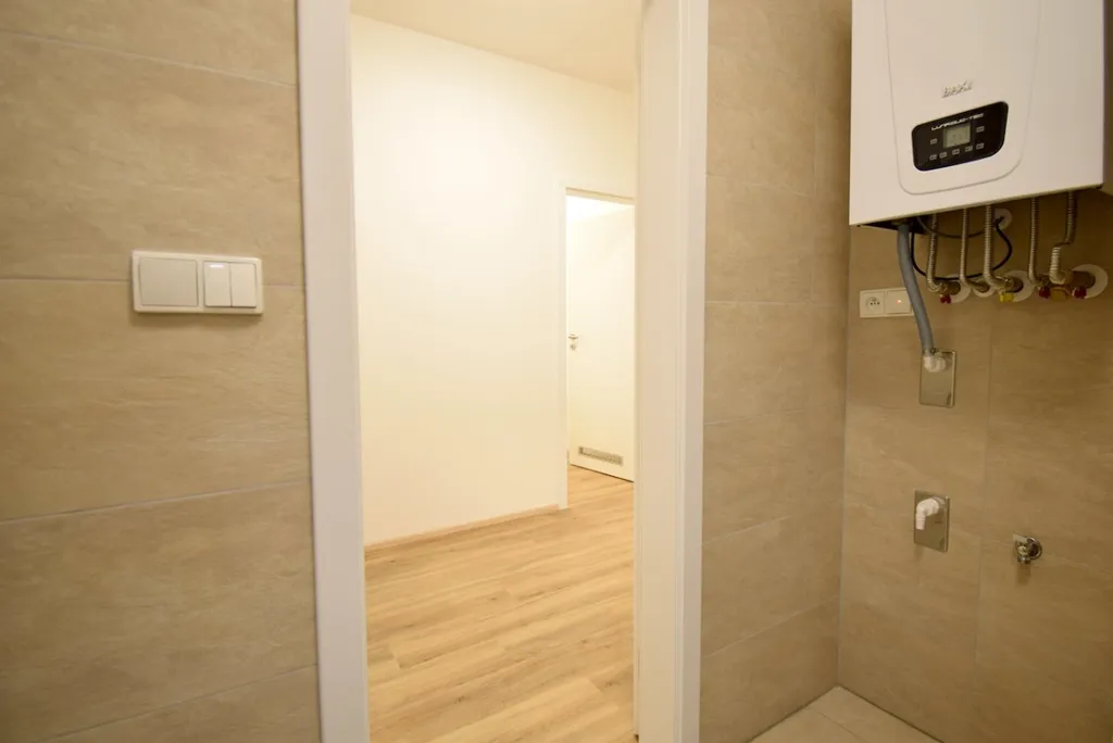 Prostorná předsíň, samostatné wc s umyvadlem, prostorná koupelna s kotlem, sprchovým koutem, přípojkou na pračku a umyvadlem.
