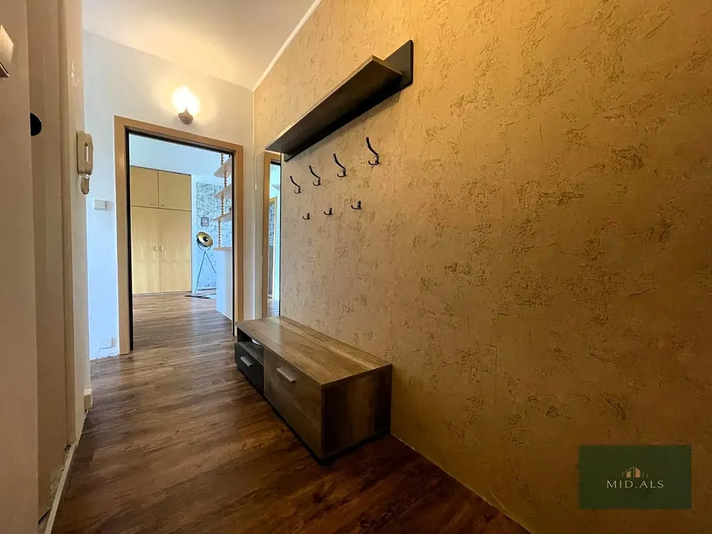 Na míru dělaná kuchyně od truhláře se pyšní novými vestavnými spotřebiči - lednička s mrazákem, elektrická trouba, indukční varná deska, digestoř. Také zde zůstává mikrovlnná trouba a pračka se sušičkou - ta je prakticky schovaná v jedné ze skříněk v kuchyni. Jídelní stůl se židlemi jsou taktéž součástí prodeje.