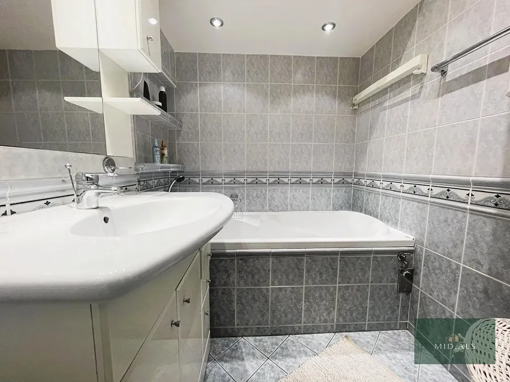 V koupelně je vana a koupelnová skříňka s umyvadlem, a skříňka na zdi. WC samostatné.