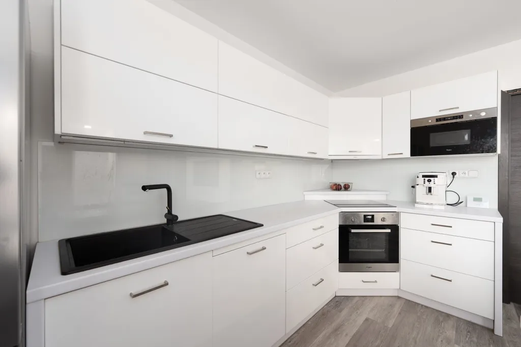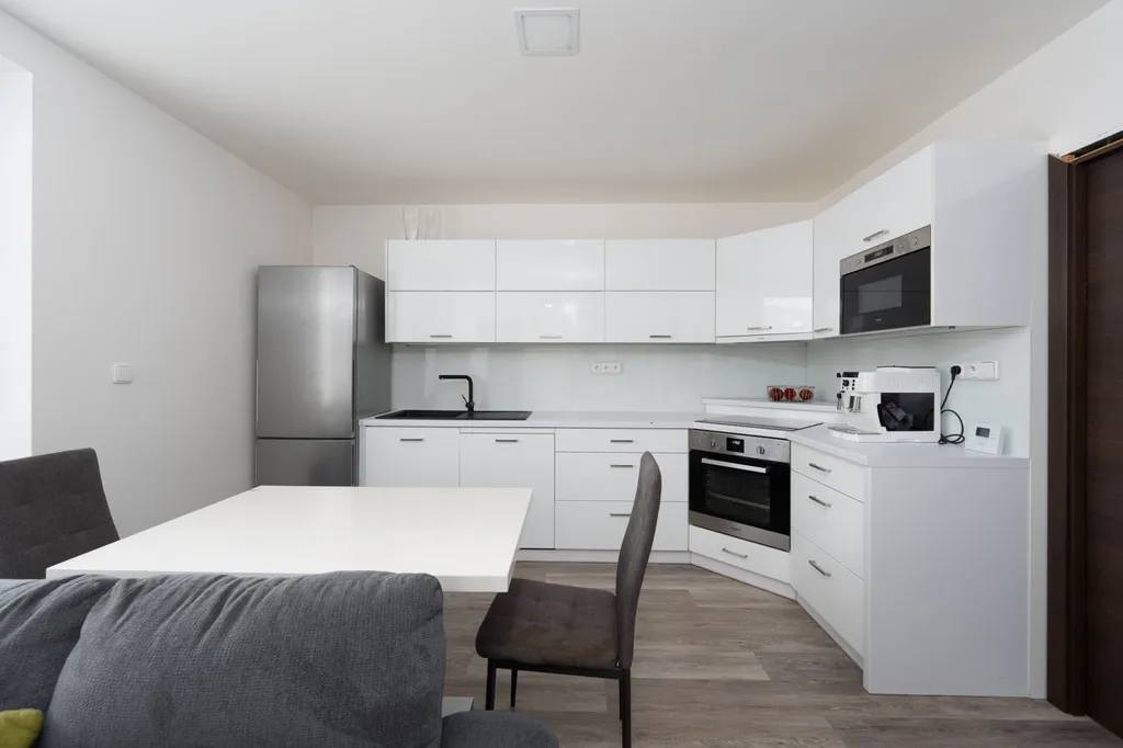 Kuchyňská linka s vestavěnými spotřebiči značky Whirlpool, mezi které patří mikrovlnná trouba, horkovzdušná trouba, myčka na nádobí a indukční varná deska. Kuchyň je prakticky řešená a přirozeně navazuje na hlavní obytnou část bytu.