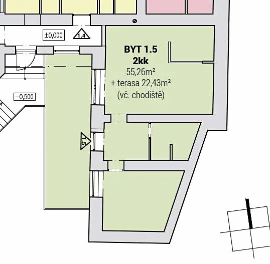 Vstup do bytu je řešen přímo z terasy, která slouží jako příjemný venkovní prostor pro posezení i relaxaci. Z terasy se vstupuje do předsíně, odkud je přístup do všech částí bytu. Po levé straně se nachází prostorný obývací pokoj propojený s kuchyňským koutem, po pravé straně ložnice a přímo z chodby vstup do koupelny s toaletou. Dispozice je velmi praktická a nabízí dostatek soukromí i pohodlí pro každodenní bydlení.