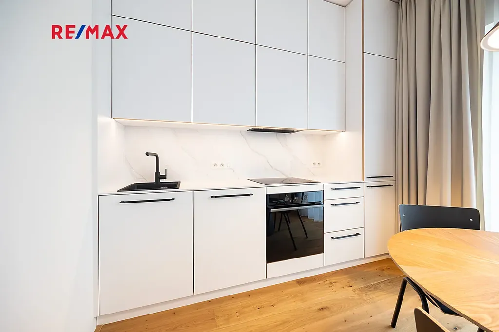 Interiér je navržený na míru a kompletně zařízený kvalitním nábytkem i spotřebiči. Obývací pokoj s kuchyňským koutem je díky francouzskému oknu velmi světlý, stejně tak i ložnice a s obou pokojů je vstup na terasu (vnitroblok ložnice, obývací pokoj ulice). Kuchyňská linka je plně vybavená vestavěnými spotřebiči.
