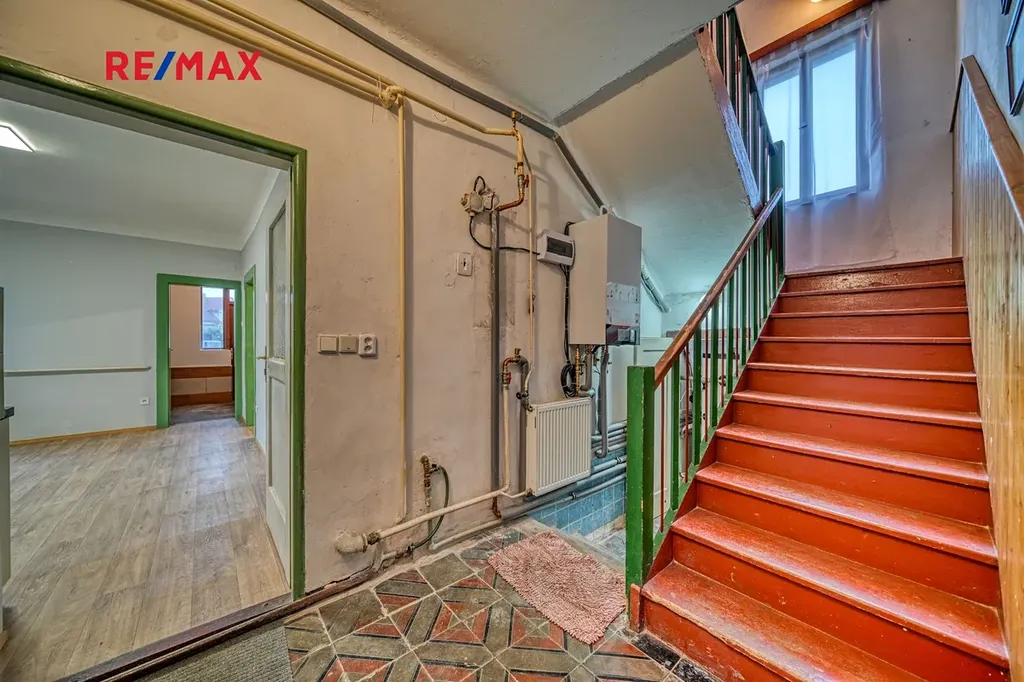 Schodiště i interiérové dveře jsou původní dřevěné a zachovávají autentický charakter domu.