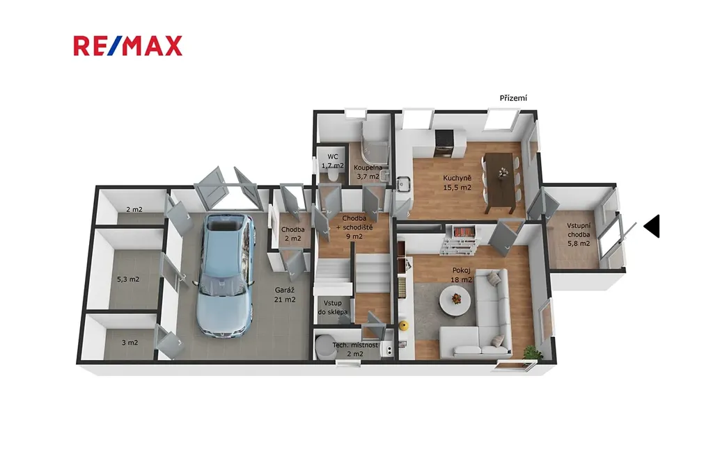 V přízemí se nachází vstupní chodba, kuchyně, pokoj, koupelna, WC a technická místnost.