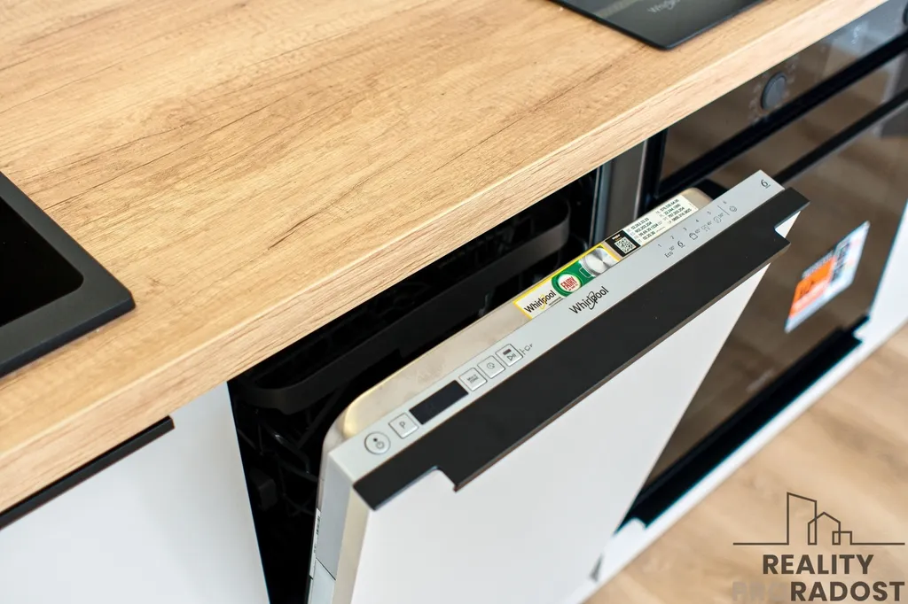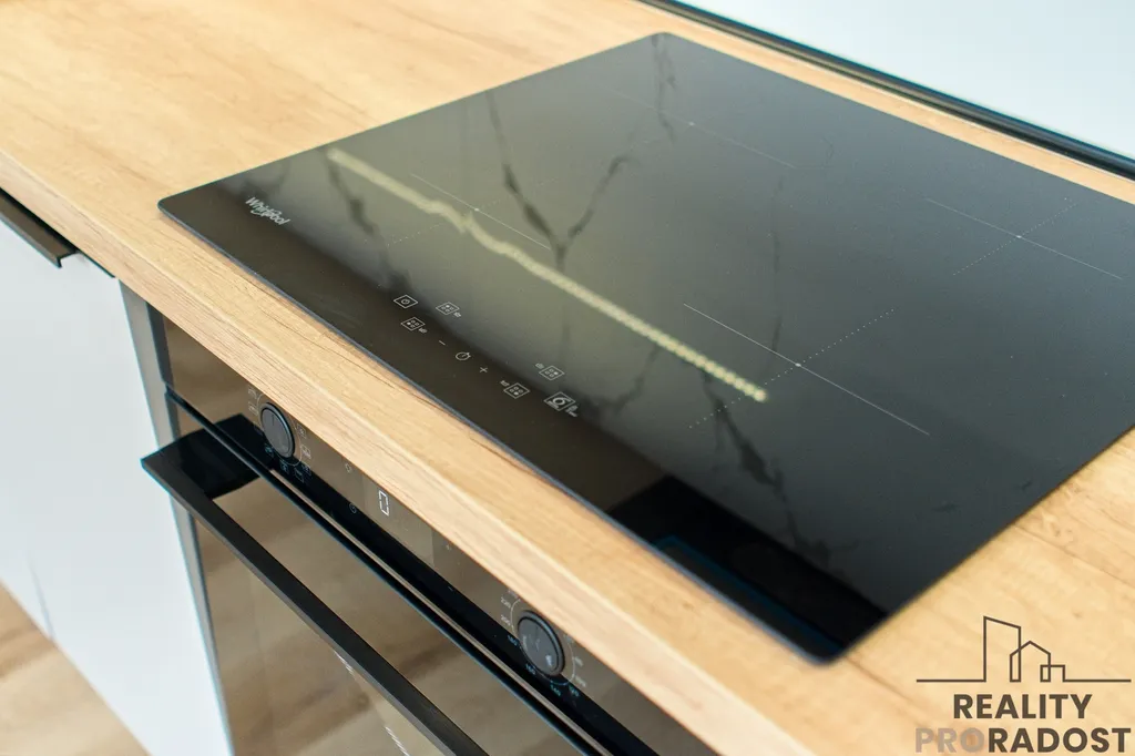 Kuchyňská linka vyrobená na míru kombinuje dekory kašmírově šedé a dubu Nebrasky. Vestavěné spotřebiče v kontrastní černé barvě (lednice s mrazákem, trouba, indukční deska, odsavač par s uhlíkovým filtrem) jsou značky Whirpool v kontrastní černé barvě, granitový dřez Franke. Kombinuje se zde systém otevírání pomocí úchytek a tip on systému, kovaní je použito od značky Blum. Pod horními skříňkami je LED osvětlení. Za pracovní deskou je použit velkoformátový obklad v dekoru mramoru.