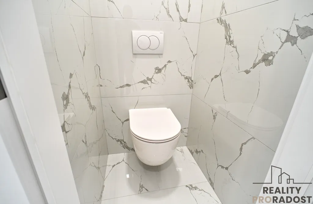 Na chodbě, v kuchyni, v koupelně a na toaletě je aplikována dlažba v dekoru bílého a antracitového mramoru v rozměru 120 x 60 cm, v pokojích je položena kvalitní voděodolná vinylová podlaha.