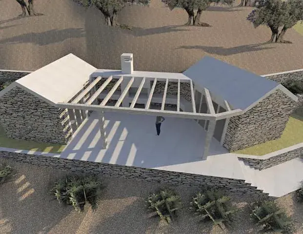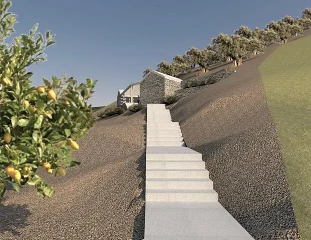 Tento pozemek lze zastavět dvěmi domy každý o zastavěné ploše 30m2 s božským výhledem na moře.