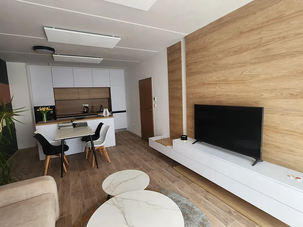 Byt 2+kk se nachází ve 3.NP. Vybavení obývacího pokoje navrhlo profesionální designové studio BD interiéry a díky vkusu, praktičnosti a neotřelým nápadům se vzhled pokoje setkává s velkým úspěchem. Toto vybavení je zahrnuto v kupní ceně. Ložnice vybavená nábytkem není.