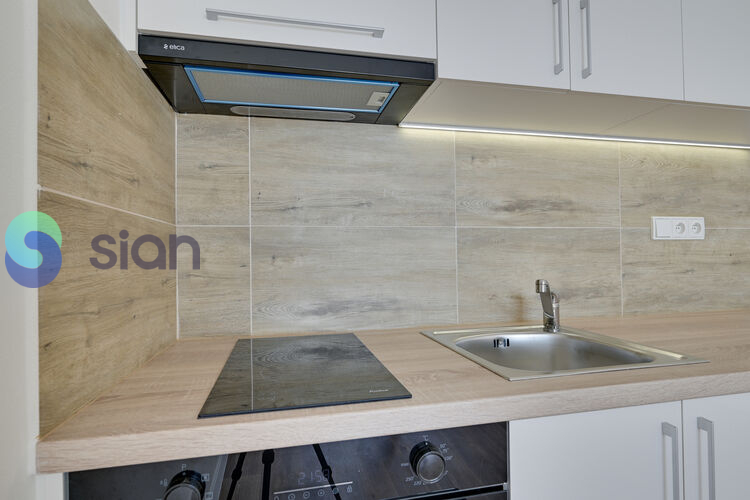 Kuchyňská linka je dělaná na míru a je opatřena vestavěnými spotřebiči (sklo keramická deska a trouba), digestoř.