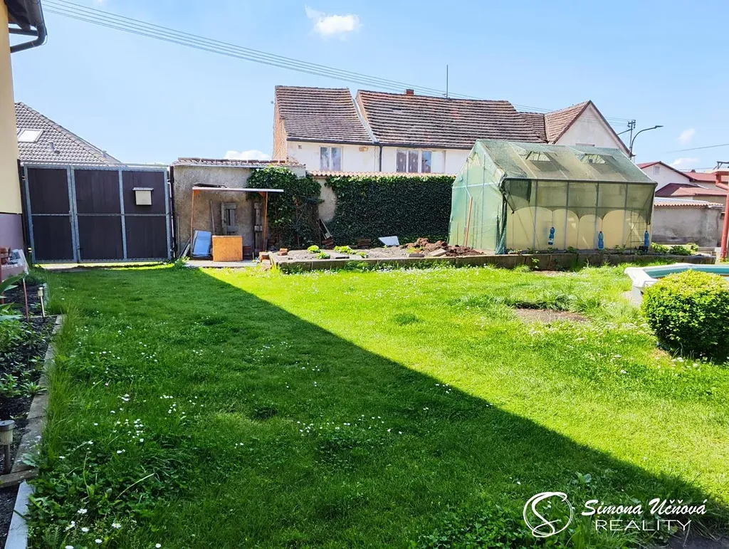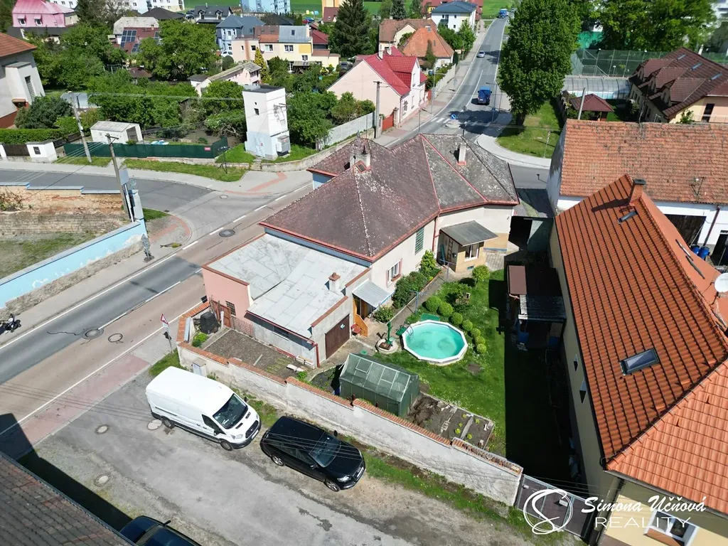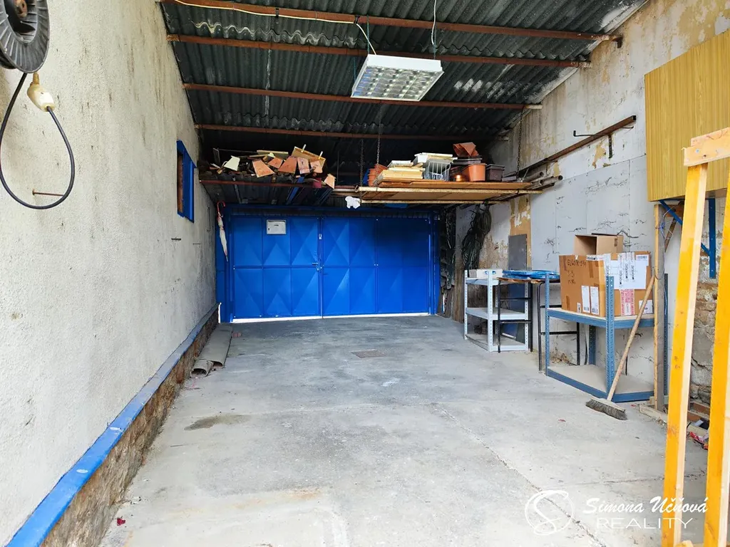 Součástí domu je zděná garáž s dílnou, s vjezdem ze zahrady a druhé kryté garážové stání, s vjezdem z veřejné komunikace.