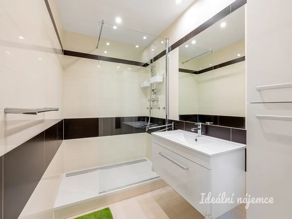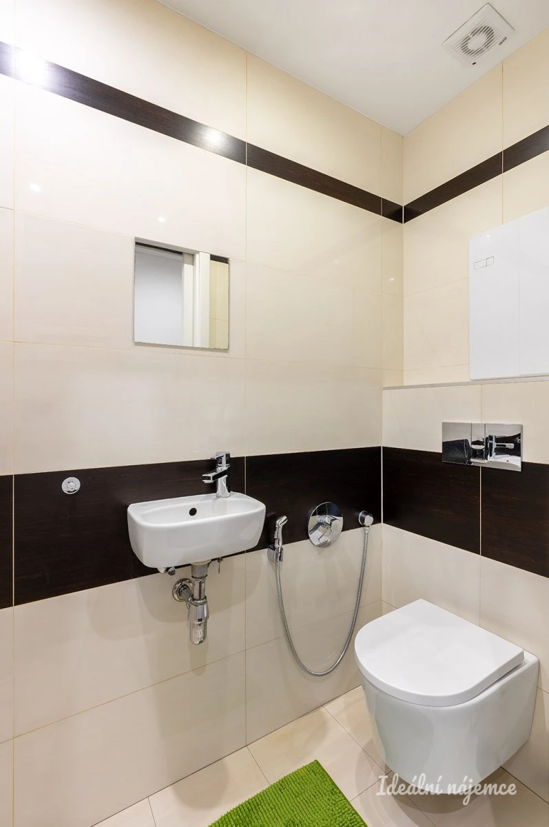 Z vstupní předsíně (ve které nalezneme vestavěné šatní skříně s pračkou a sušičkou) je možné vstoupit na samostatnou toaletu s umyvadlem a bidetovou sprškou, či do koupelny s prostorným sprchovým koutem s odtokovým žlábkem a zástěnou.