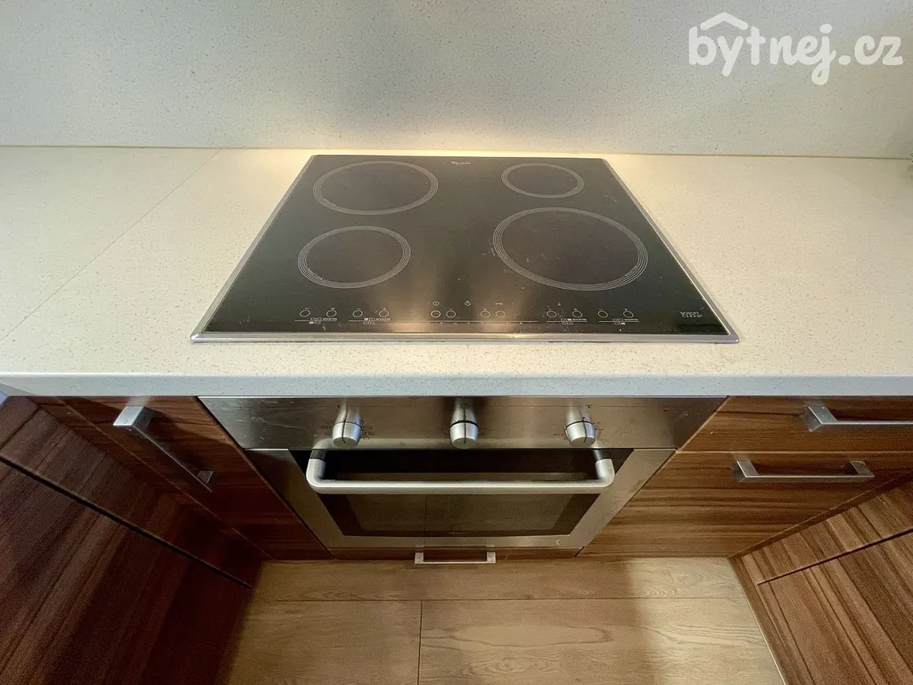 Součástí kuchyňské linky je elektrická trouba, varná deska, digestoř, mikrovlnná trouba a myčka nádobí.
