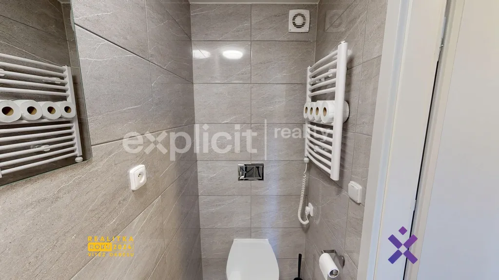 Moderní a čistá koupelna se sprchovým koutem je společně s toaletou sloučena dohromady.