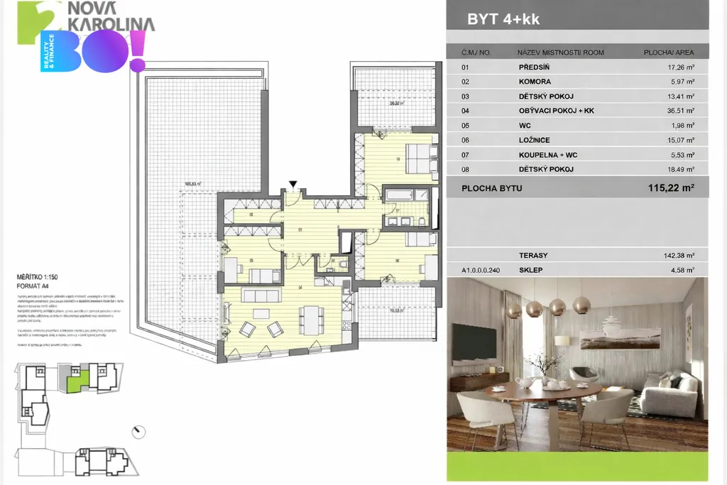 Byt o podlahové ploše se 115 m² a terasy 142 m² je šikovně dispozičně řešen tak, aby nabízel dostatek prostoru pro komfortní život.