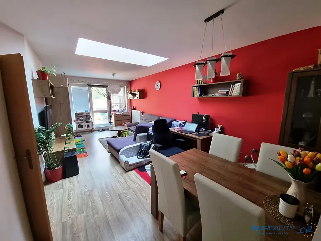 Dispozice : vstupní chodba se sociálním zařízením, komora, vlevo dětský pokoj, dále obývací pokoj s kuchyňskou linkou a vstupem na terasu, ložnice.