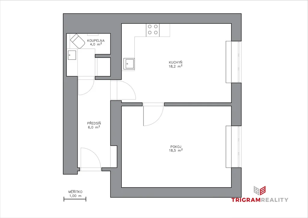 Detailní dispozice naleznete v přiloženém půdorysu. Byt disponuje hlavním obytným prostorem s kuchyňskou linkou vybavenou troubou, varnou deskou a digestoří. Koupelna je vybavena vanou a umyvadlem, nechybí přípojka na pračku. K užívání je i menší komora. WC je samostatné.