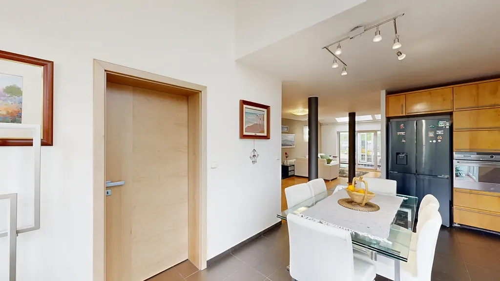 Součástí prodeje je plně vybavená kuchyňská linka se zabudovanými spotřebiči, vestavěné skříně a další nábytek.