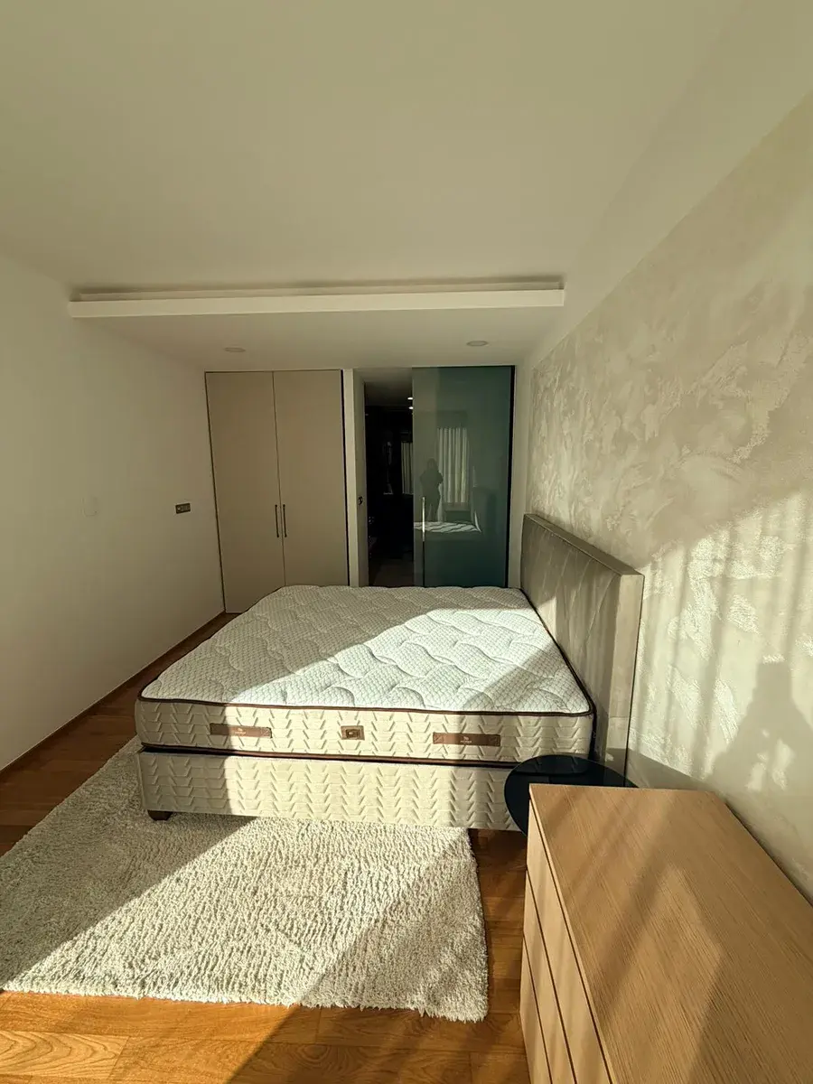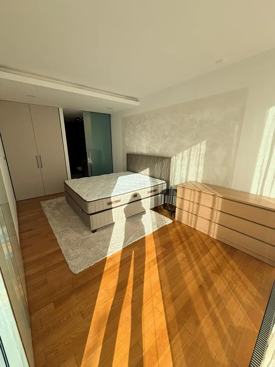 Hlavní koupelna je kompletně obložená mramorem a nabízí jak zapuštěnou vanu pro relaxační koupele, tak sprchový kout pro rychlé osvěžení. Vstup je přímo z ložnice.