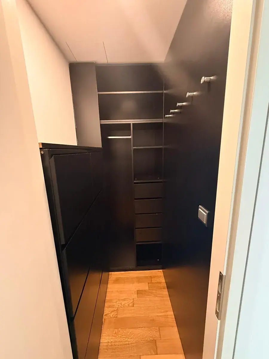 Prostorná šatna s vestavěnými skříněmi nabízí dostatek místa pro veškeré oblečení a díky své velikosti lze část využít i jako domácí pracovnu - ideální pro home office.