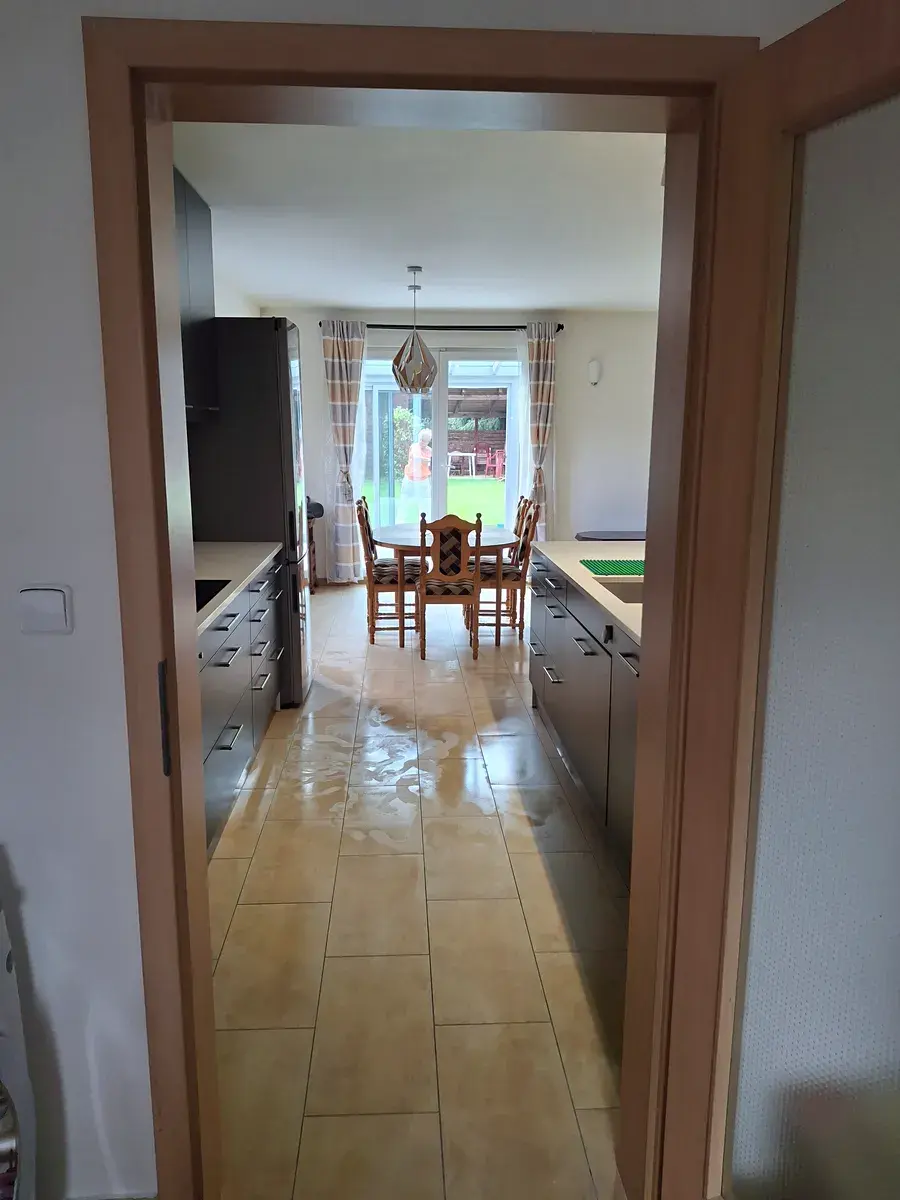 OP s kuchyní 44 m2. Kuchyň je vybavena veškerými spotřebiči, myčka lednice s mrazákem, el. trouba, mikrovlnka, sklokeramická deska. Tato místnost je osazena krbovými kamny, které jsou schopny vytopit celé spodní prostory domu. Na tomto podlaží je zádveří 5 m2, koupelna 2,5 m2, úložný prostor 1,5 m2, technická místnost 6m2. Toaleta.
