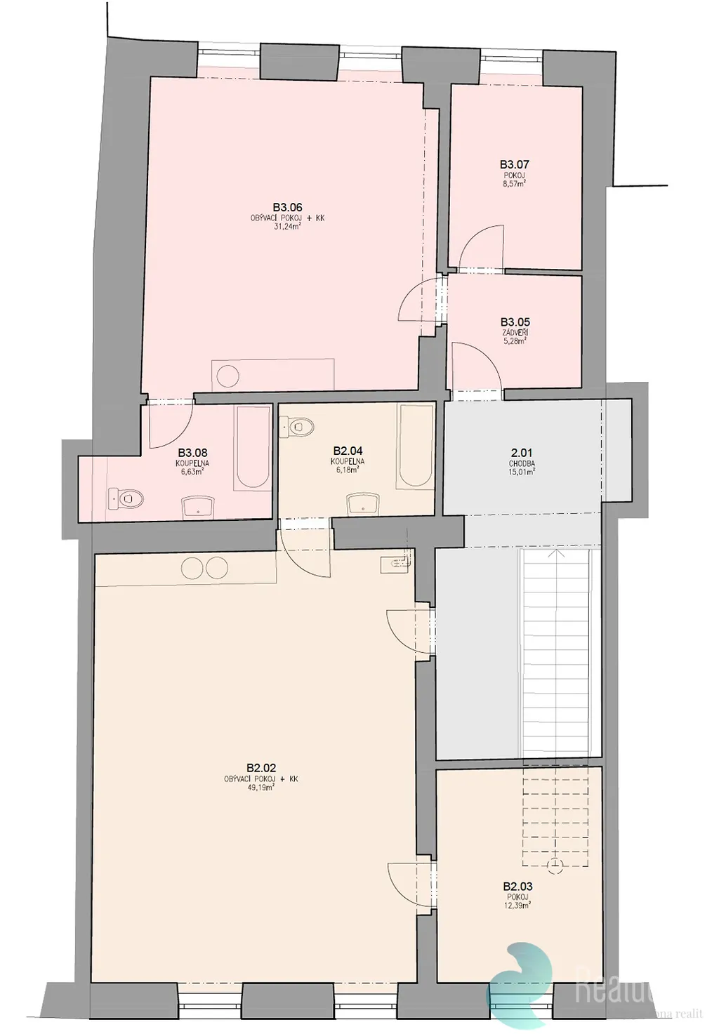 V prvním patře se nachází dva byty 2 +KK 52 m² a 67 m²), které jsou vhodné jak pro vlastní bydlení, tak i pro pronájem. Byty jsou v původním, dobrém stavu a stejně jako byt v přízemí jsou nyní pronajaty. Dům je vytápěn kotlem na tuhá paliva a je napojen na městský vodovod a kanalizaci. Protože v průběhu minulých let probíhaly základní opravy domu, dům je možné využívat okamžitě. Pro komfortnější bydlení je ovšem třeba uvažovat o rekonstrukci.