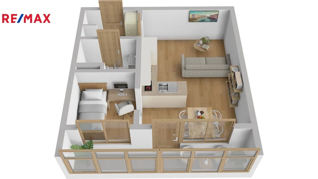 Ve výhradním zastoupení společnosti RE/MAX Future nabízíme k pronájmu velmi pěkný byt o dispozici 1+1 se zasklenou lodžií, který se nachází ve čtvrtém nadzemním podlaží bytového panelového domu s výtahem v ulici Ječná v Hradci Králové. Bytová jednotka o celkové ploše 42 m2 (včetně sklepa a lodžie) a užitné ploše 34 m2 je částečně vybavená. Větší z pokojů je vybaven kuchyňskou linkou s dvouplotýnkovou indukční deskou, mikrovlnnou troubou a digestoří. V menším pokoji instalovány police a závěsné skříňky. Byt je vybaven dále novou lednicí a pračkou. Na podlaze v pokojích je nová vinylová podlaha. Koupelna se sprchovým koutem, toaletou a umyvadlem s koupelnovou skříňkou má zděné jádro. V zádveří je botník a menší odkládací prostor na oblečení. Okna bytové jednotky jsou vybavena žaluziemi a lodžie stínícími roletami. Zasklená lodžie o výměře 6 m2 poskytuje možnost posezení a uložení sezónních věcí. K dispozici sklepní kóje a prostorná kolárna, pozemek za bytovým domem je oplocen.