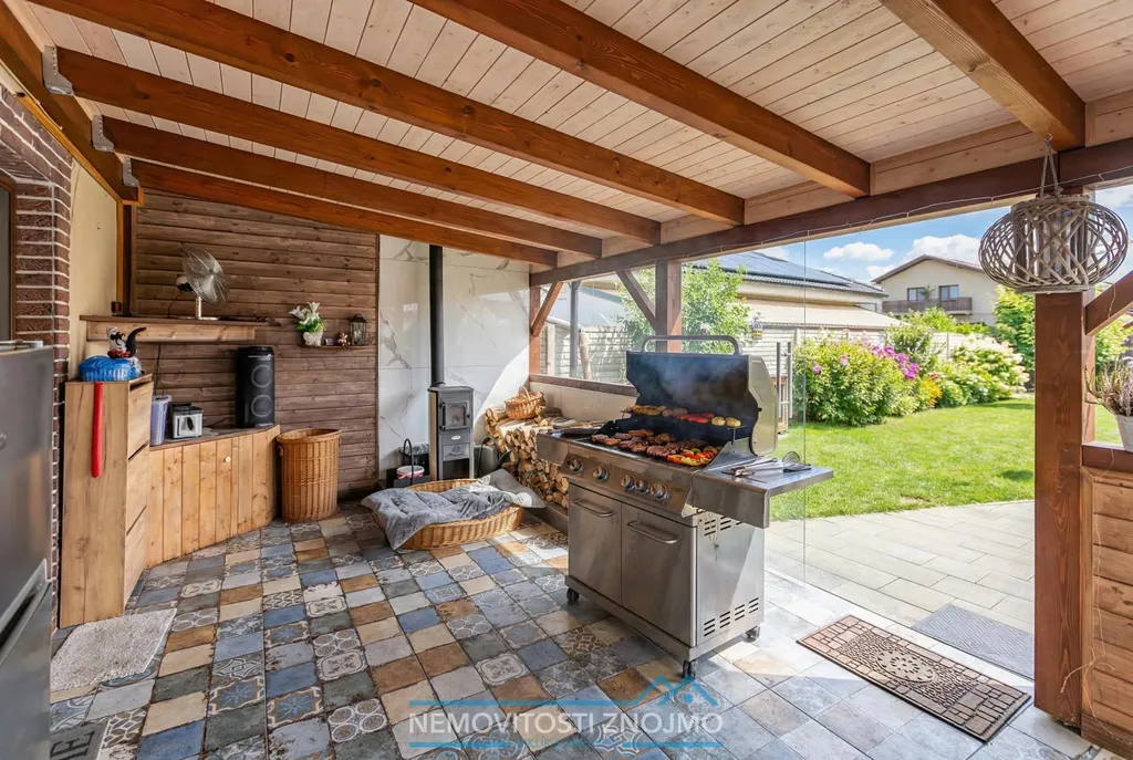 Za domem se dále nachází pergola, pod kterou se rozkládá mobilní vířívka. A dále se zde vchází do hospodářského zázemí, kde je kůlna a spíž.